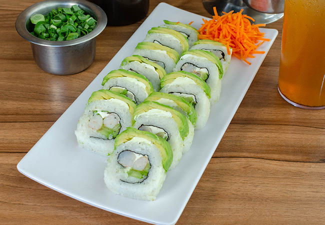 Relleno de camarón, aguacate, pepino y philadelphia; con aguacate y philadelphia por fuera.