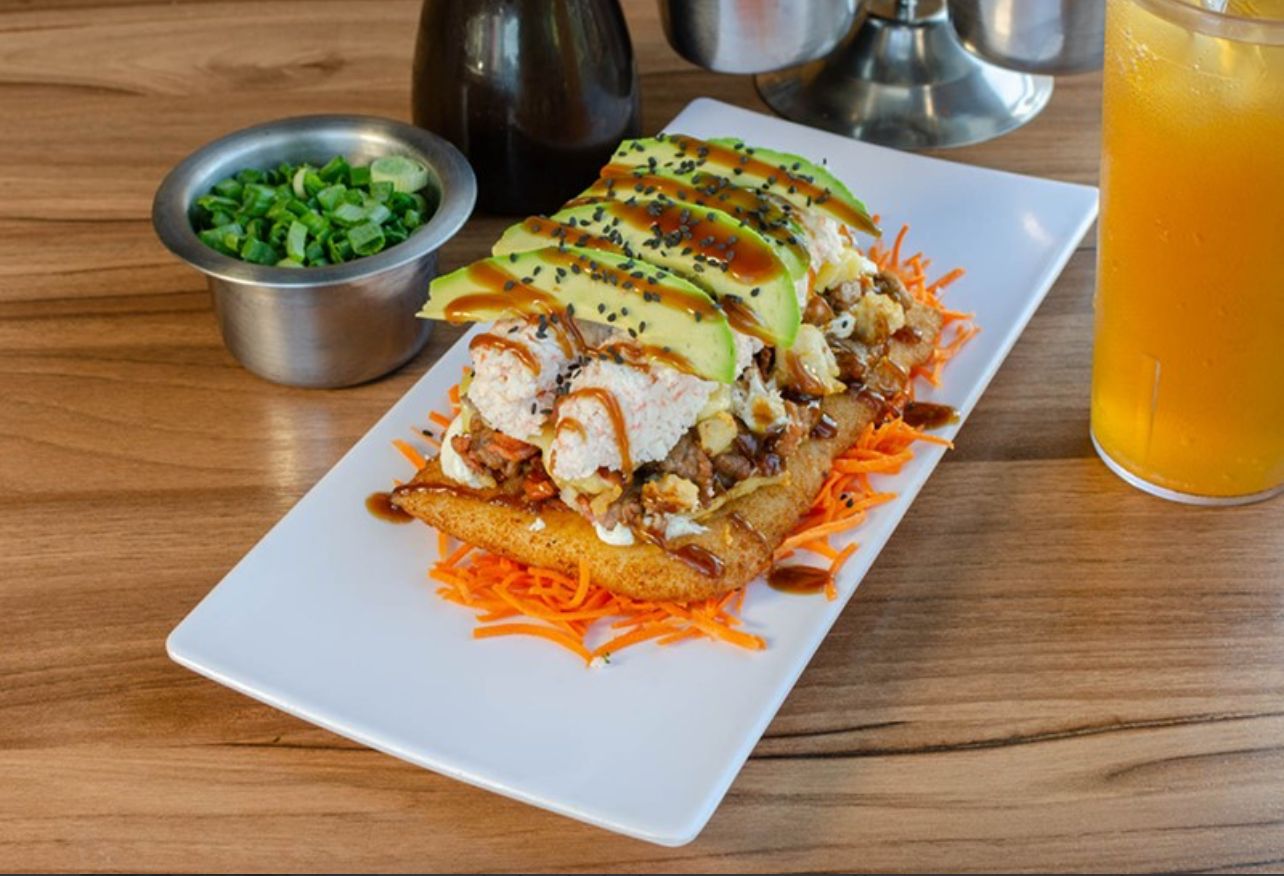 Aguacate y philadelphia sobre una cama de arroz; coronada con tampico chiw, camarones empanizados y mishohiro fleck, bañada de aderezo de cilantro y salsa yakitori.