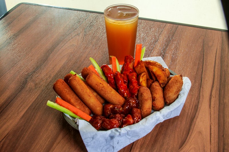 Combinación de 4 Boneless, 4 alitas, 5 dedos de queso, 4 chileños, vegetales y papas en gajos; acompañados de aderezo ranch y salsa buffalo.