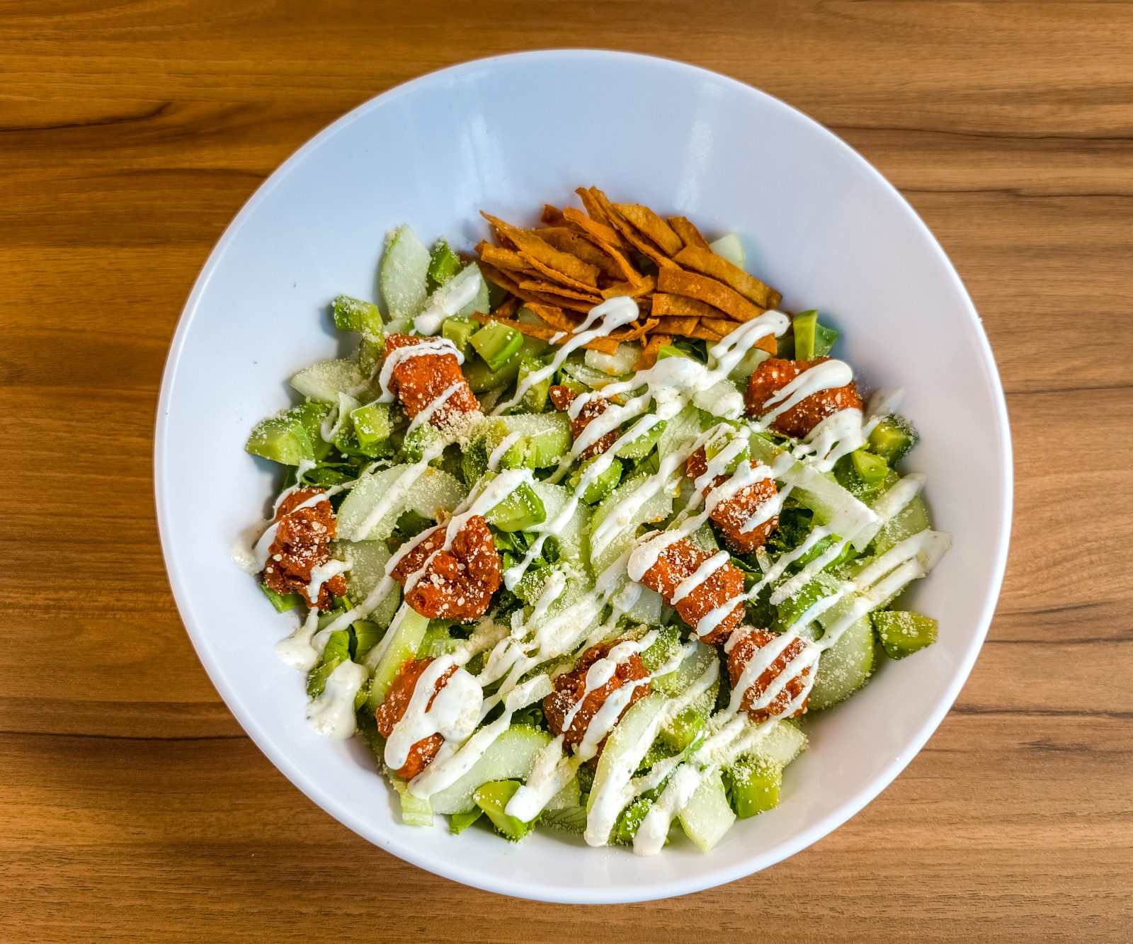 Base de combinación de lechugas, pepino, aguacate y media orden de boneless con salsa a elegir (BBQ, Buffalo o Red Hot). Con queso parmesano y aderezo a elegir.