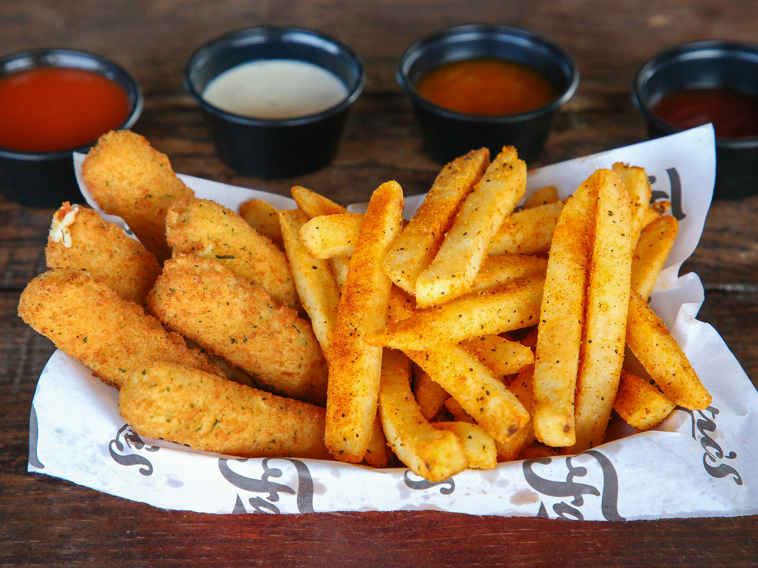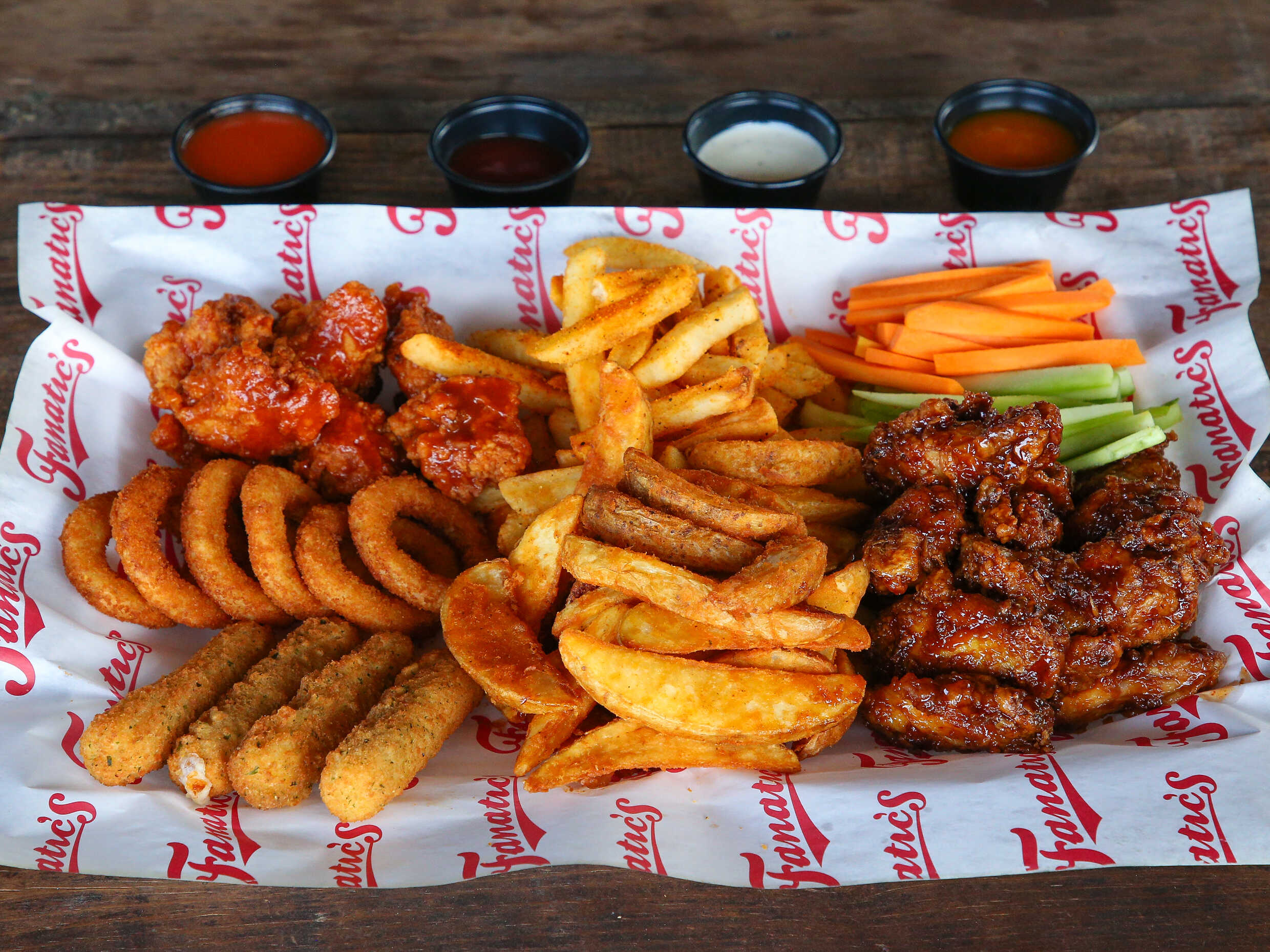 12 alitas, 6 boneless, papas, 5 aros de cebolla, 4 dedos de queso.