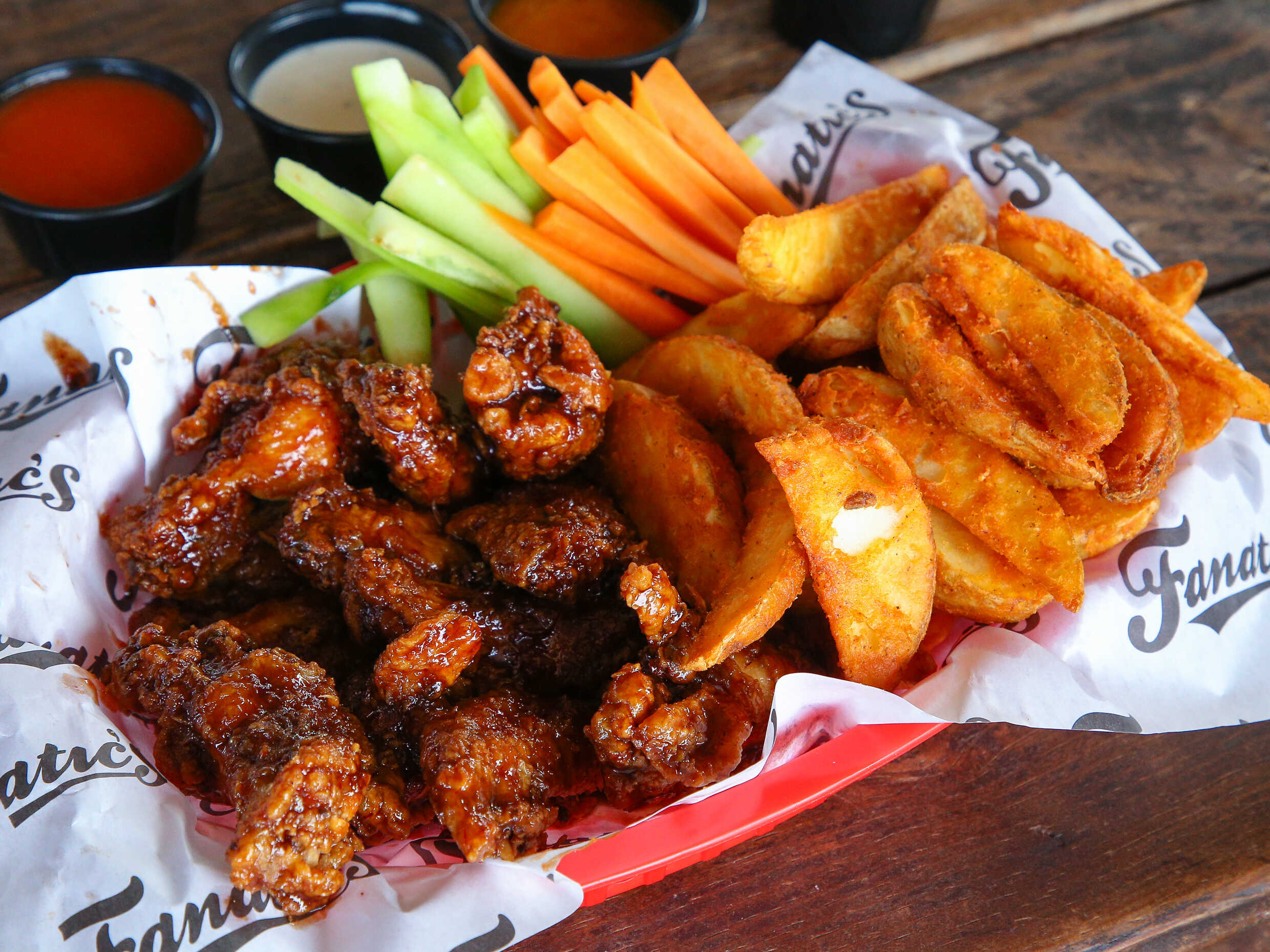 24 piezas alitas, incluye papas y vegetales.