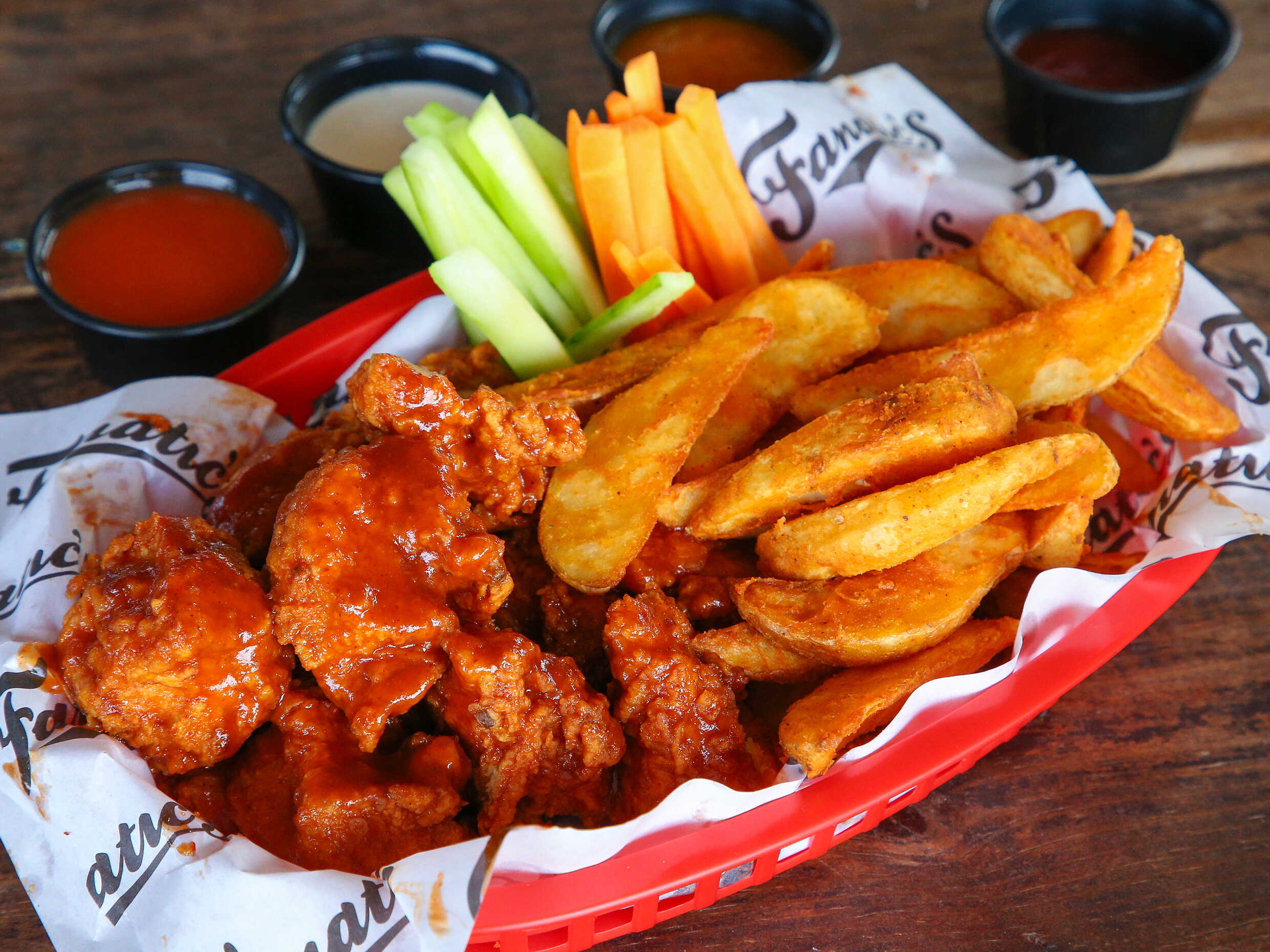 6 piezas alitas, incluye papas y vegetales.