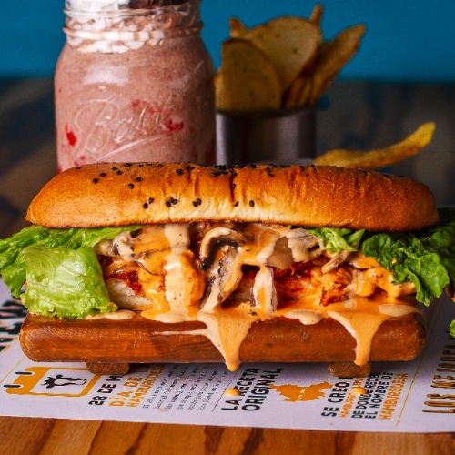 Pan de hamburguesa, pechuga de pollo a la plancha, queso manchego, crujientes meteoritos de tocino, fritura de cebolla, lechuga y aderezo de cilantro.