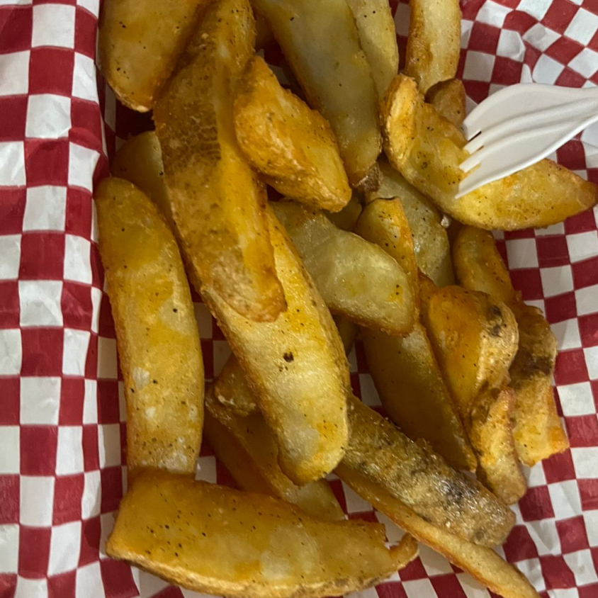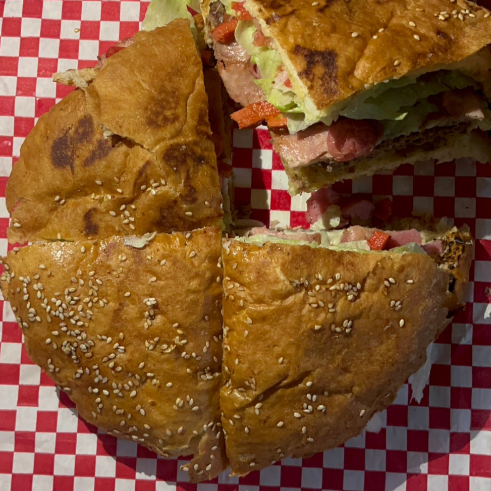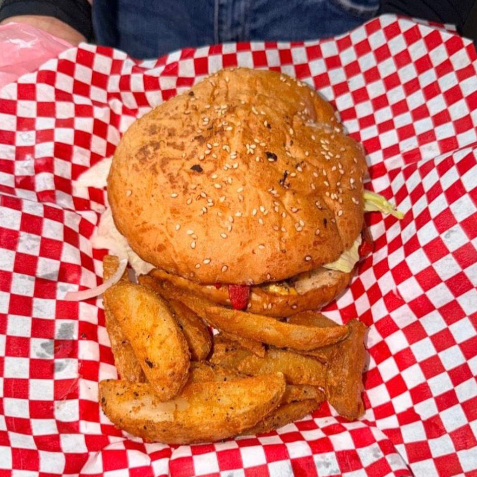 Pan casero, carne molida de res, queso americano, lechuga, tomate y cebolla. (incluye papas)