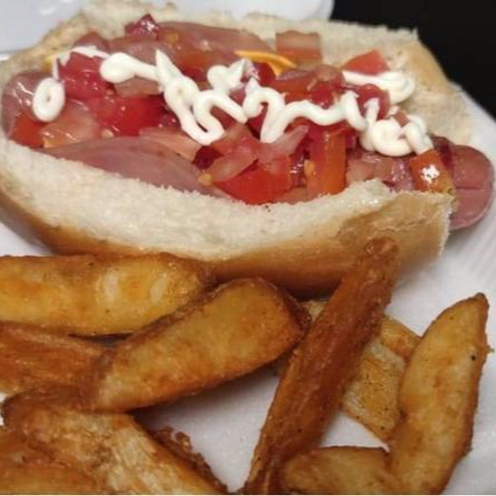Salchicha de pavo enrrollada en tocino, jamón, pan casero con mayonesa, queso amarillo, gratinado de queso chihuahua, tomate y cebolla acompañado de papas gajo