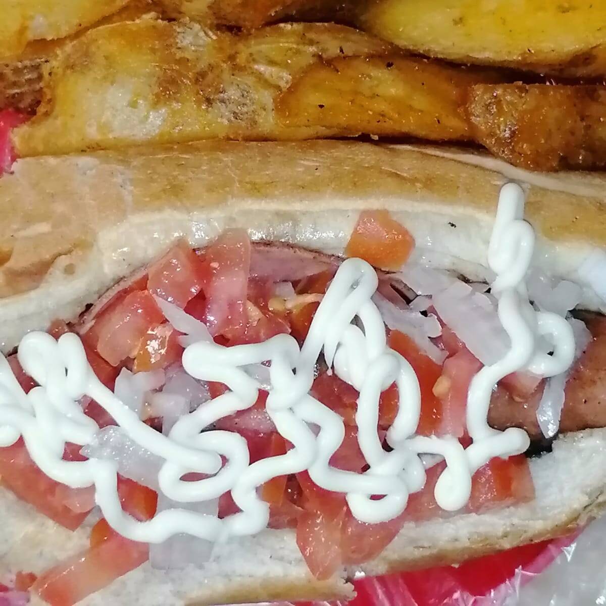 Salchicha de pavo enrrollada en tocino, pan casero con mayonesa, tomate y cebolla acompañado de papas gajo