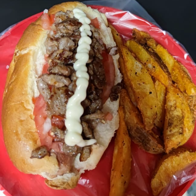 Salchicha de pavo enrrollada en tocino, jamón, pan casero con mayonesa, queso amarillo, gratinado de queso chihuahua, carne asada, tomate y cebolla acompañado de papas gajo