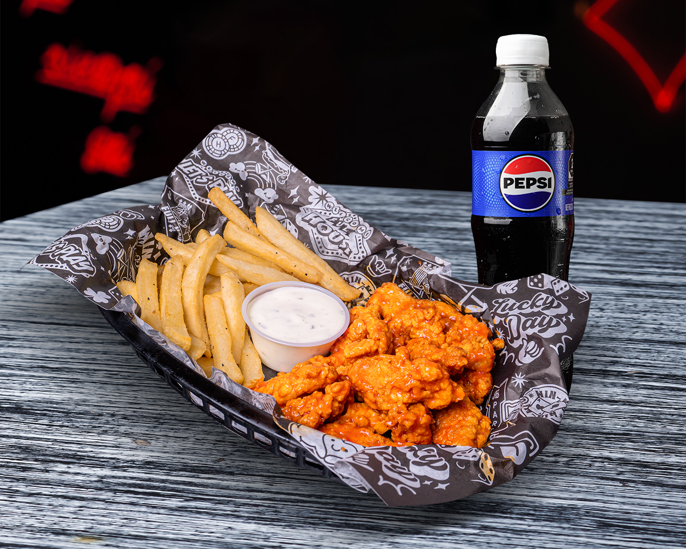 Tiras crujientes de pechuga de pollo (250 gr.) bañadas en tu salsa favorita. acompañadas de papas a la francesa o chips y aderezo. (Ranch o blue cheese) + refresco a alegir
