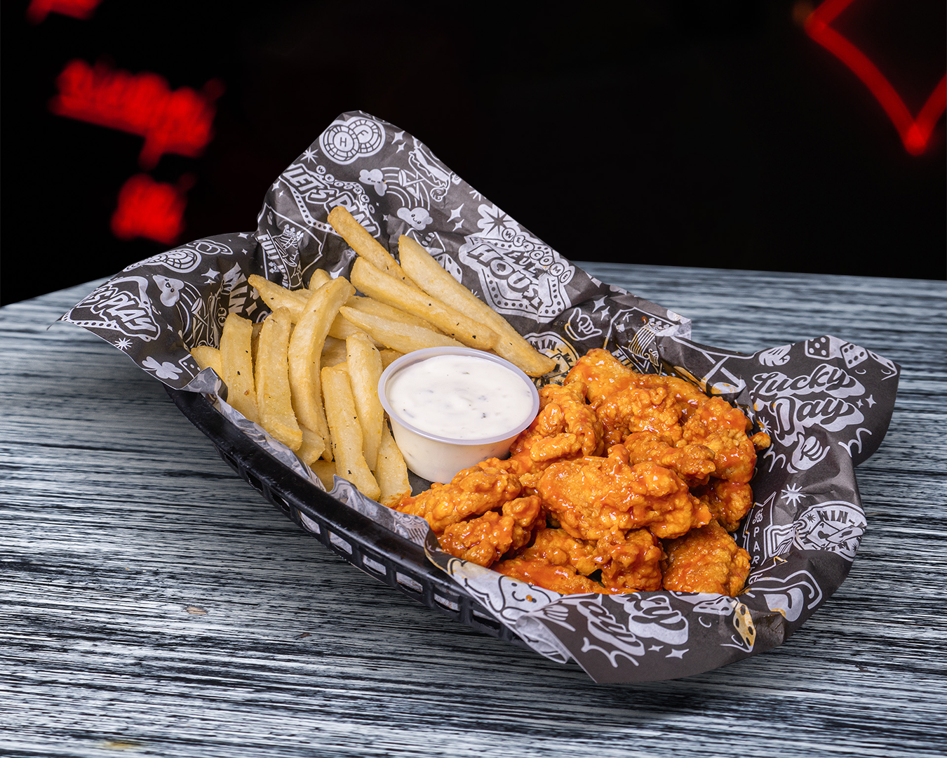 Crujientes alitas de pollo (400 gr.), bañadas en salsa a elegir, acompañadas de papas a la francesa o chips y aderezo. (ranch o blue cheese).