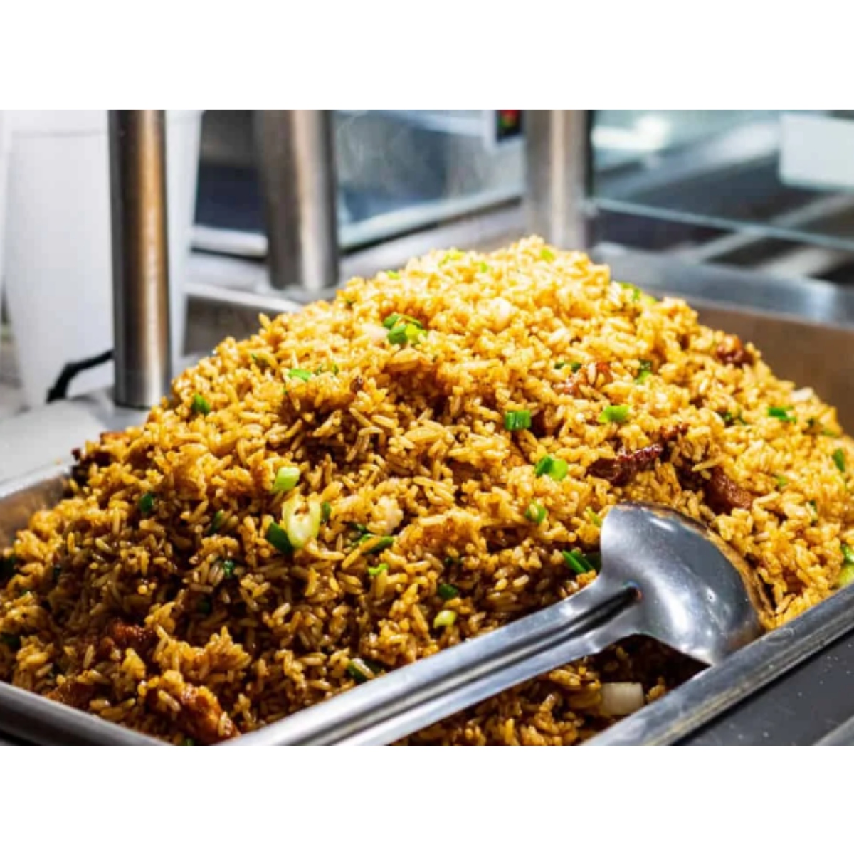 Arroz frito con salsa oscura, carne de cerdo y cebollín.