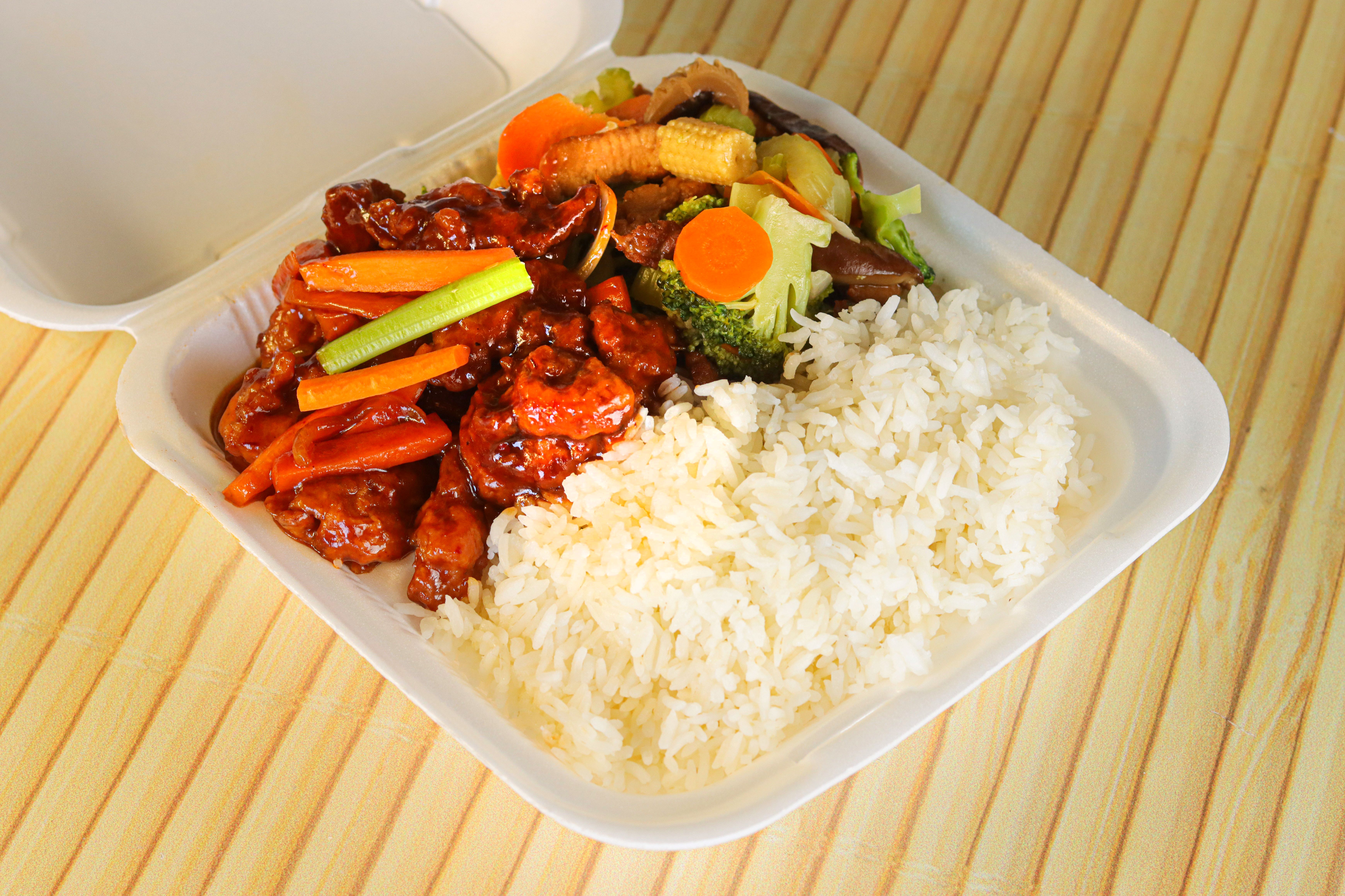 Pollo cocinado con nuestra receta especial, con verduras frescas (brócoli, zanahoria, apio, cebolla, chayote) y nuestra salsa de la casa.