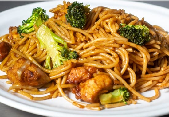 Fideos guisados con salsa oscura con pollo y brócoli.