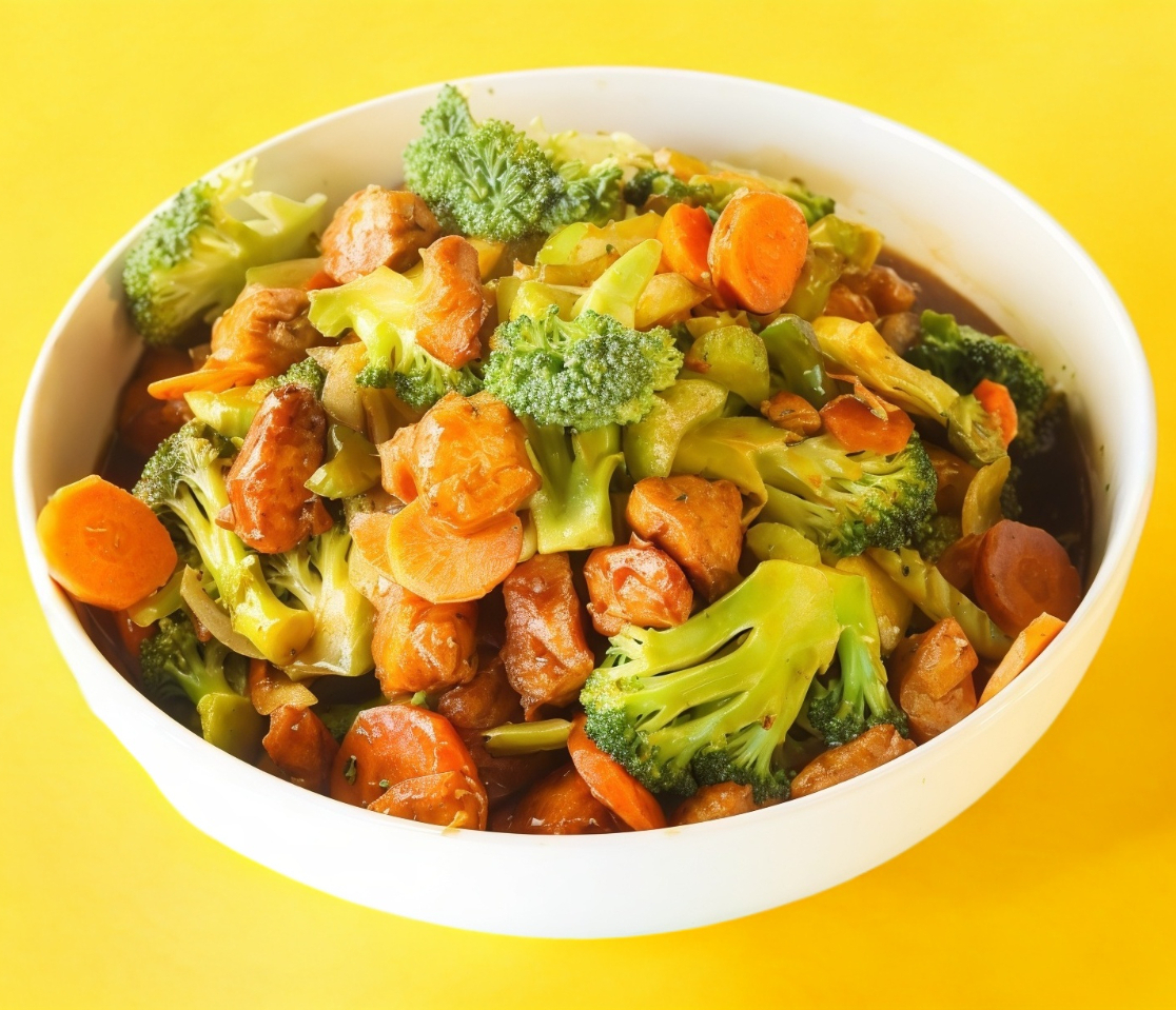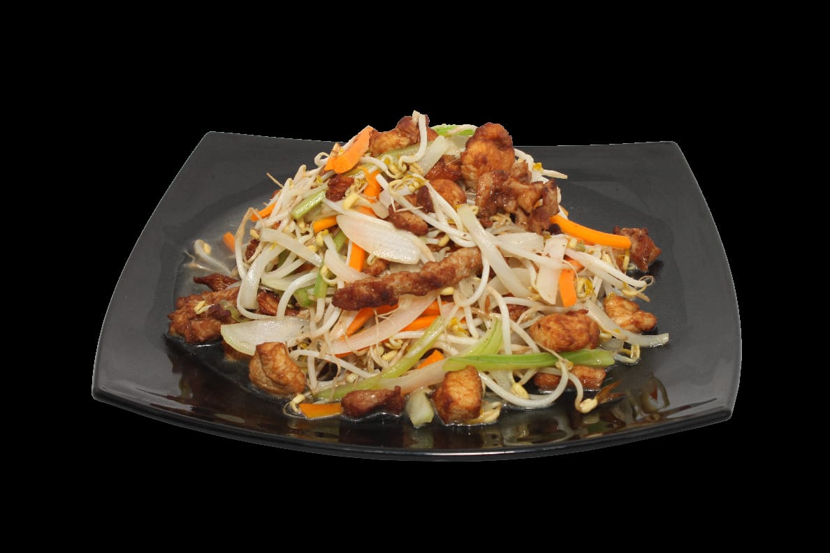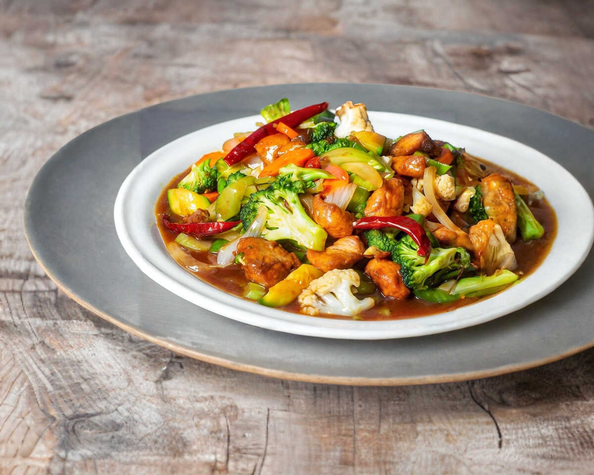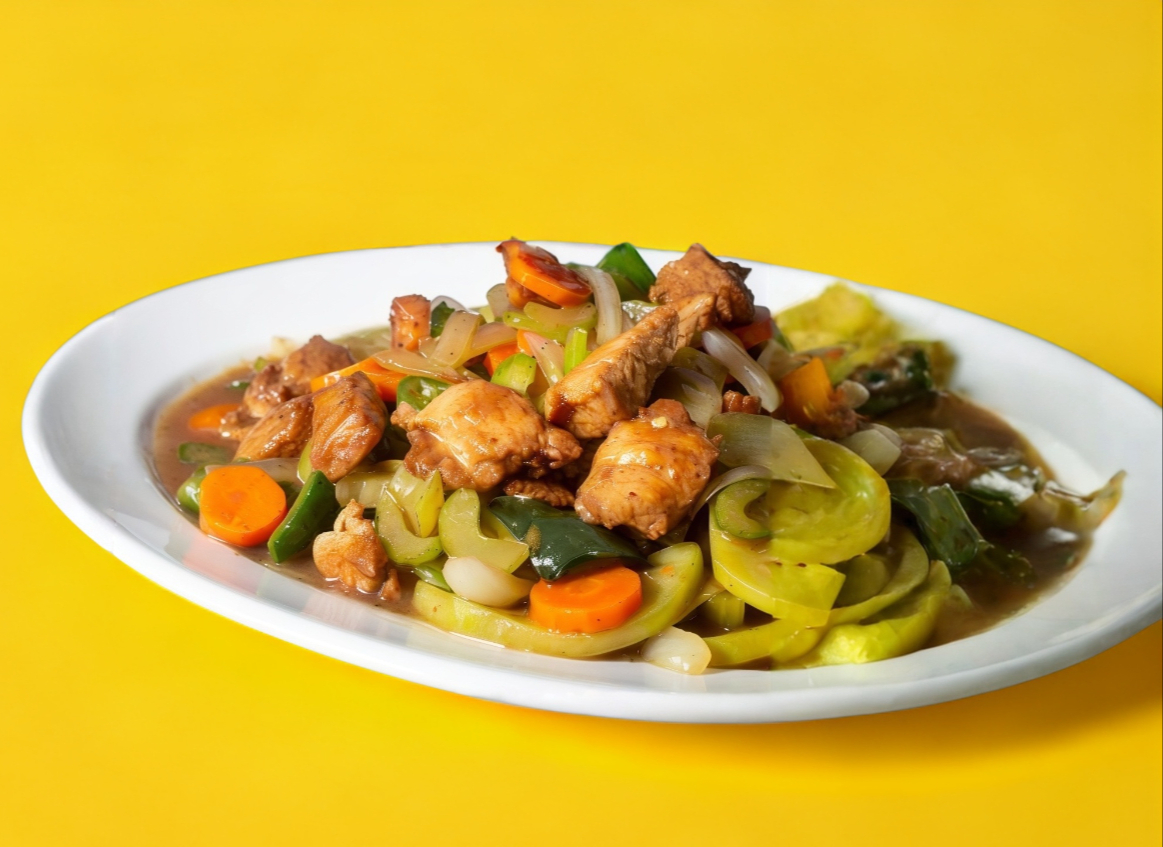 Guiso de pollo con brócoli, calabacita, coliflor, pimiento, zanahoria, apio, cebolla y chile de árbol, con un toque de nuestra salsa de ostión.