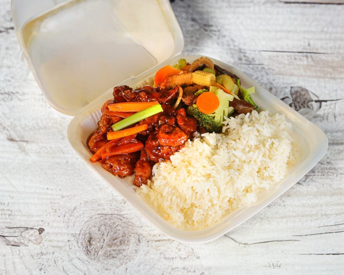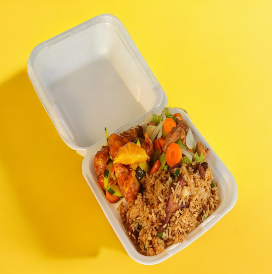 2 guisos a elegir + arroz frito +1 rollo de verdura + 1 té de 1 litro