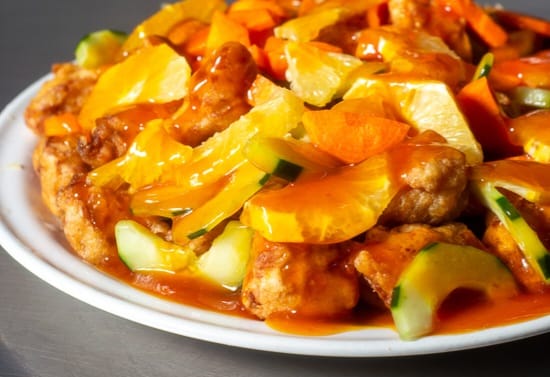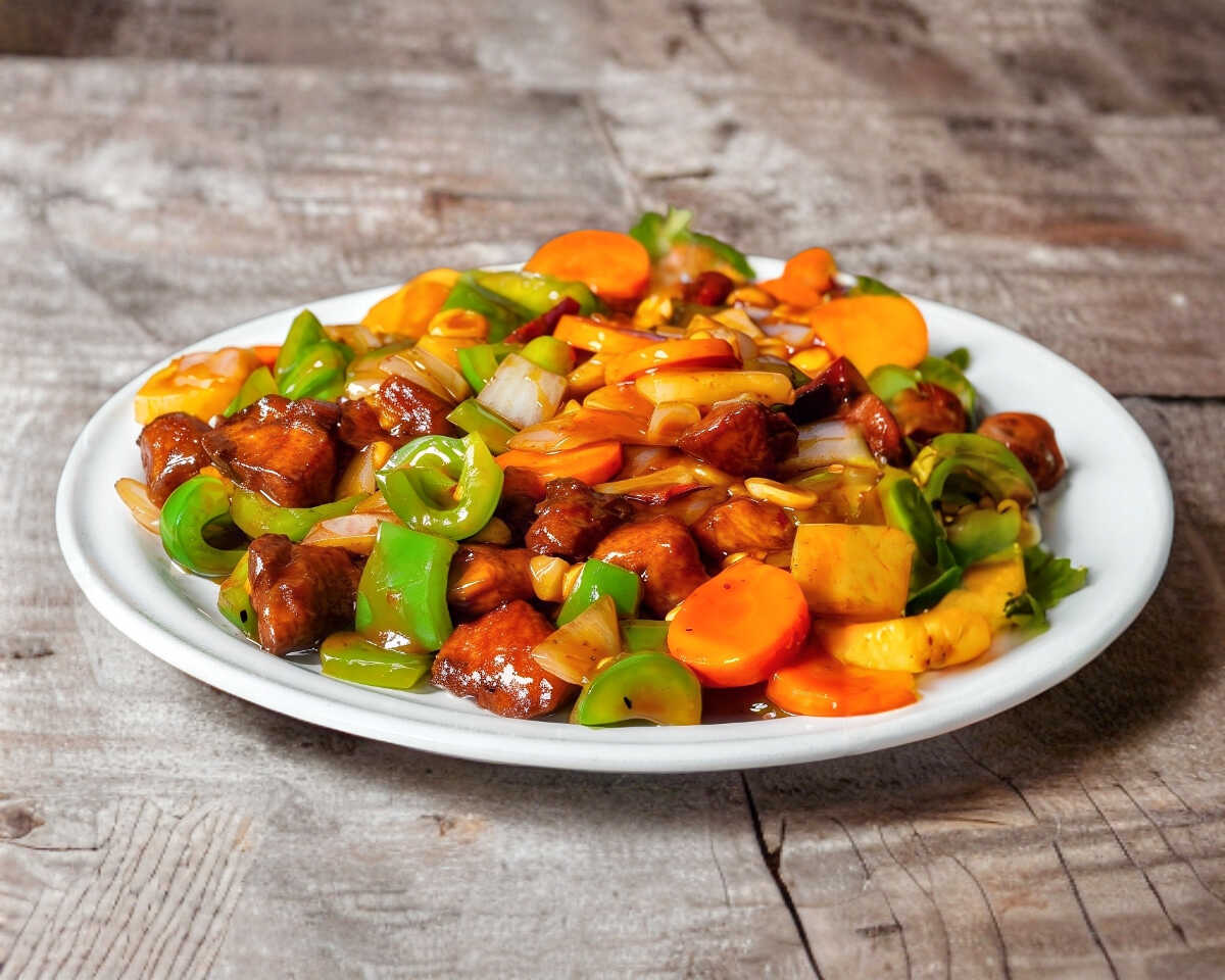 Rico y picosito guiso de pollo con nuestra salsa kung pao guisado con brócoli, cebolla, apio, pimientos, cacahuate, jícama y zanahoria.
