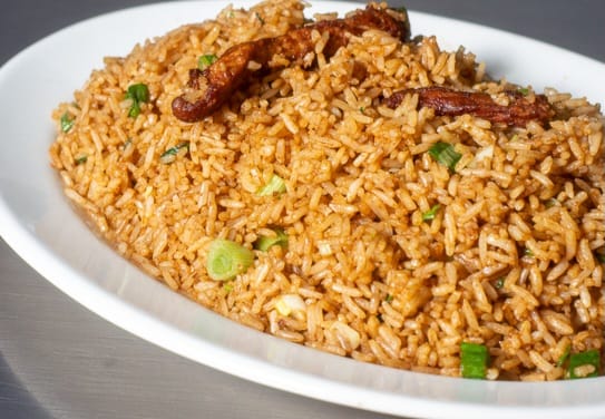 Arroz frito con salsa oscura, carne de cerdo y cebollín.