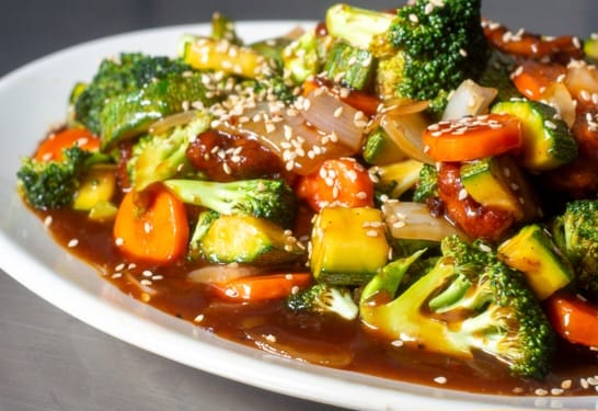 Guiso de pollo con calabacita, zanahoria, apio, cebolla y brócoli, en nuestra salsa teriyaki, atrévete a probar nuestra a probar nuestra receta con el mejor sazón.