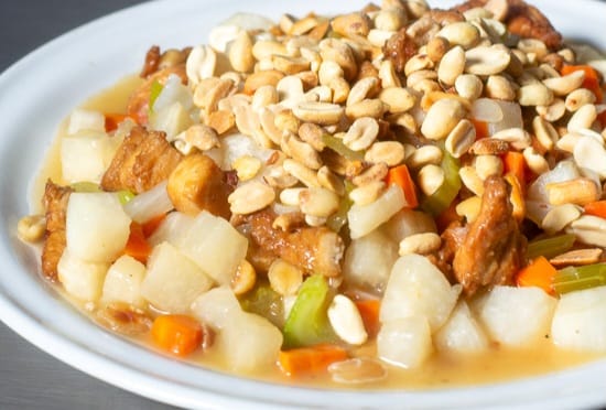 Guiso de pollo guisado con jícama, zanahoria, apio, cebolla y cacahuate, con el mejor sazón.