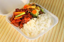 Rico y picosito guiso de pollo con nuestra salsa kung pao guisado con brócoli, cebolla, apio, pimientos, cacahuate, jícama y zanahoria.