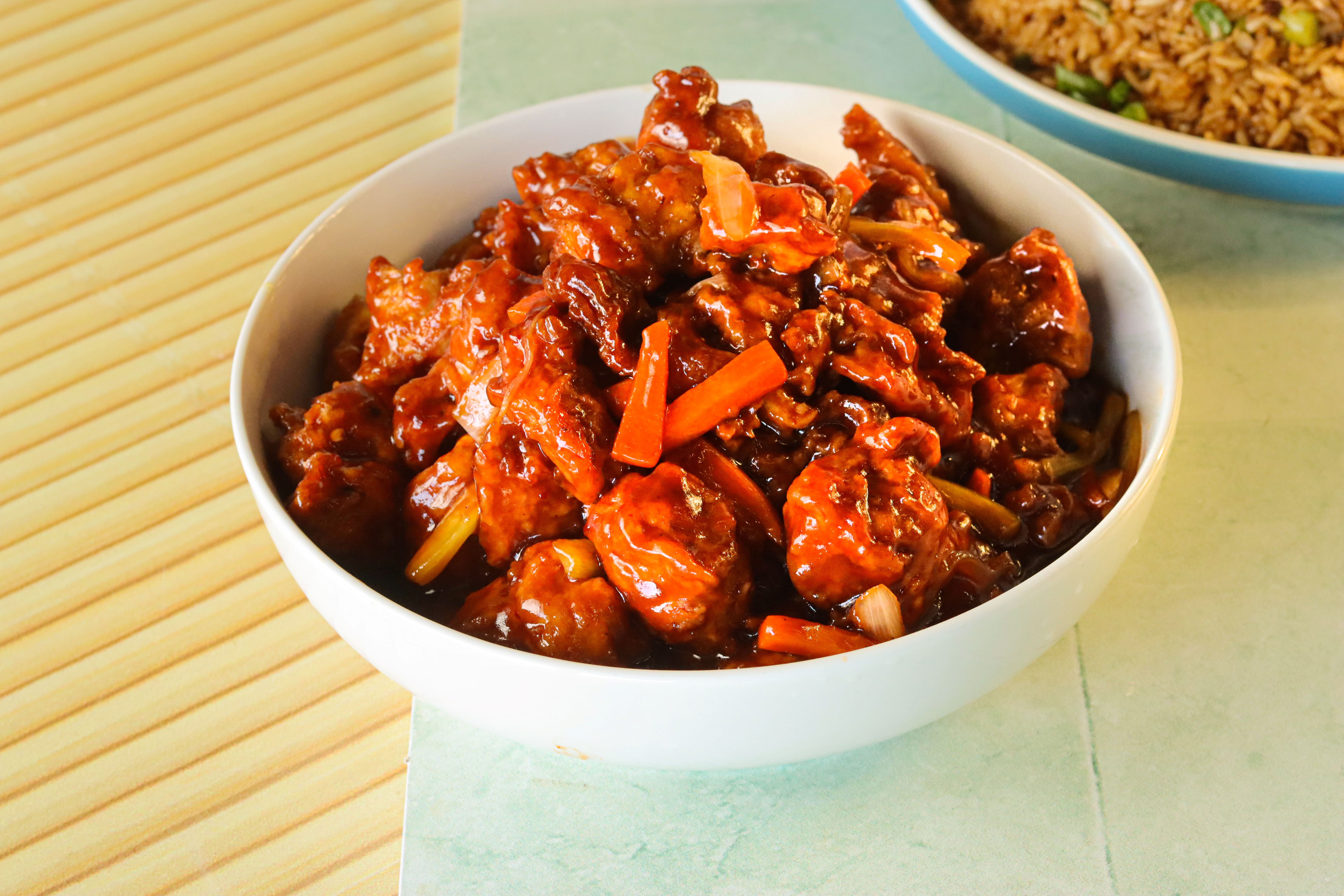 Pollo rebosado, ahogado en salsa agridulce y picosita de mango.
