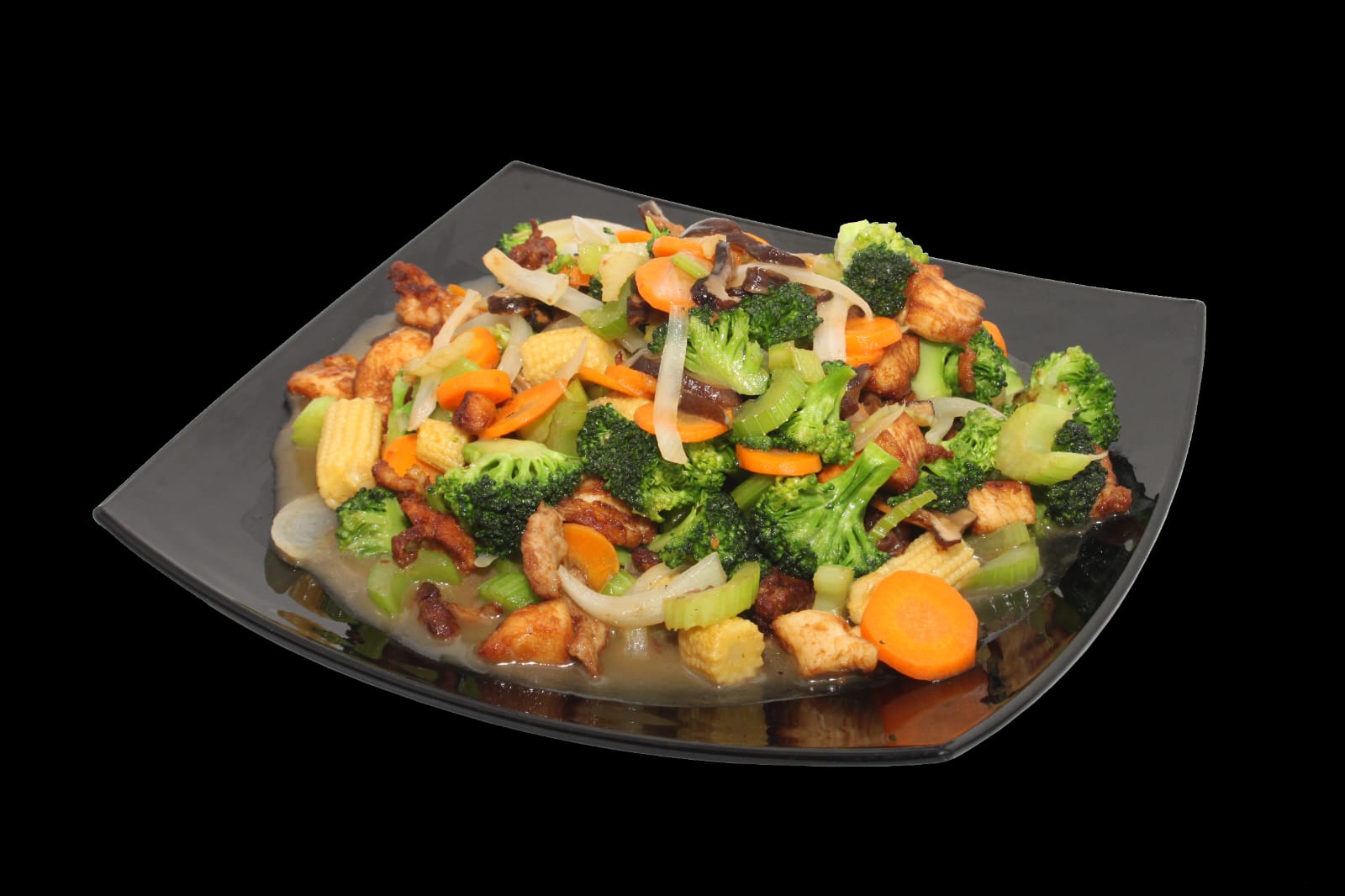 Pollo cocinado con nuestra receta especial, con verduras frescas (brócoli, zanahoria, apio, cebolla, chayote) y nuestra salsa de la casa.