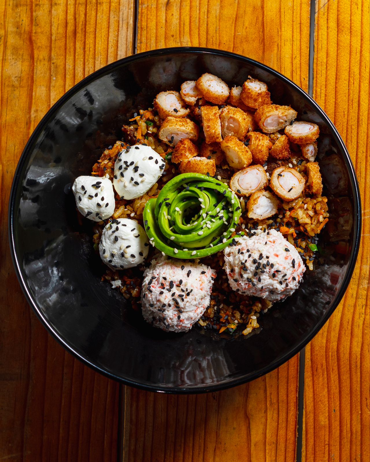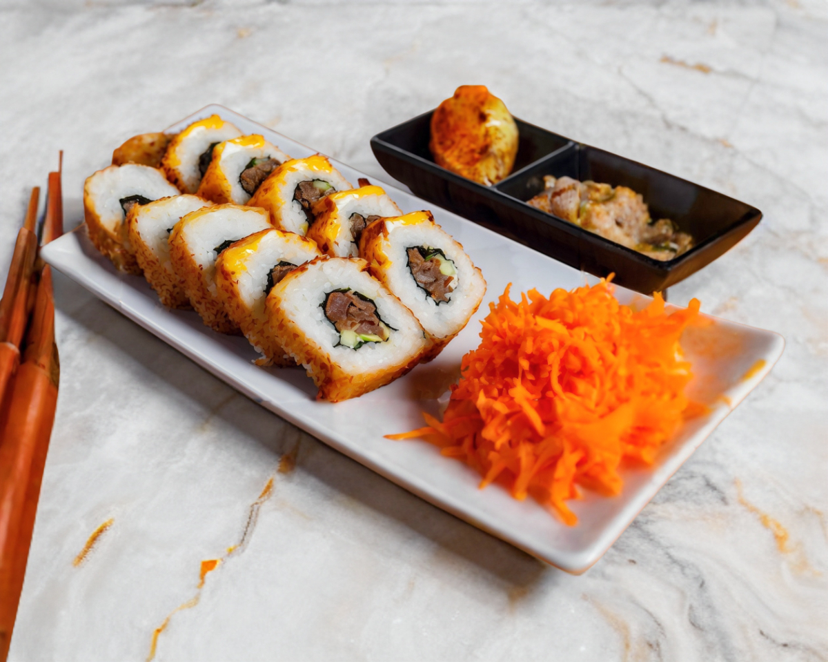 Arroz con trozos de carne de res, cebollín y zanahoria, decorado con bolitas de tampico, Philadelphia, aguacate y camarón empanizado.