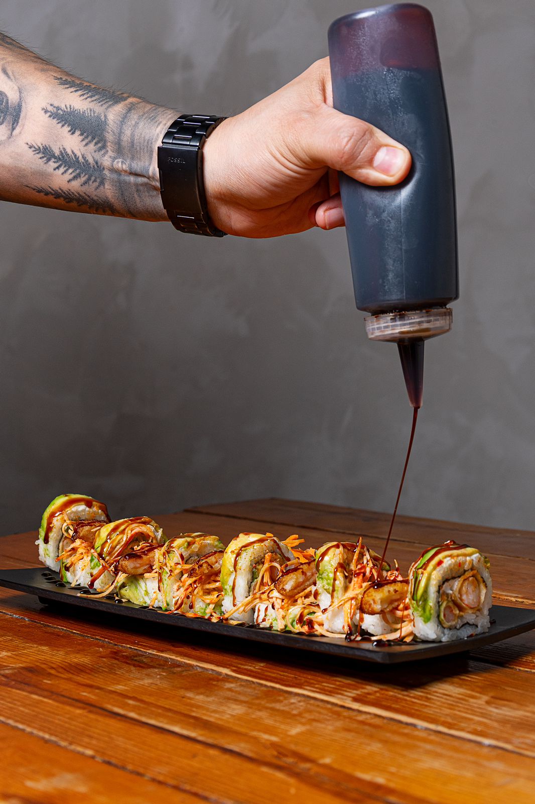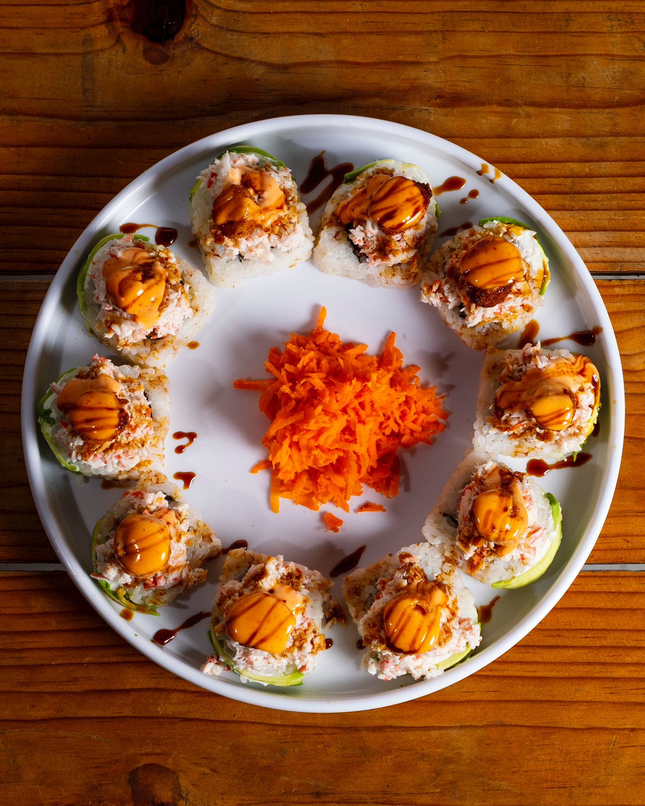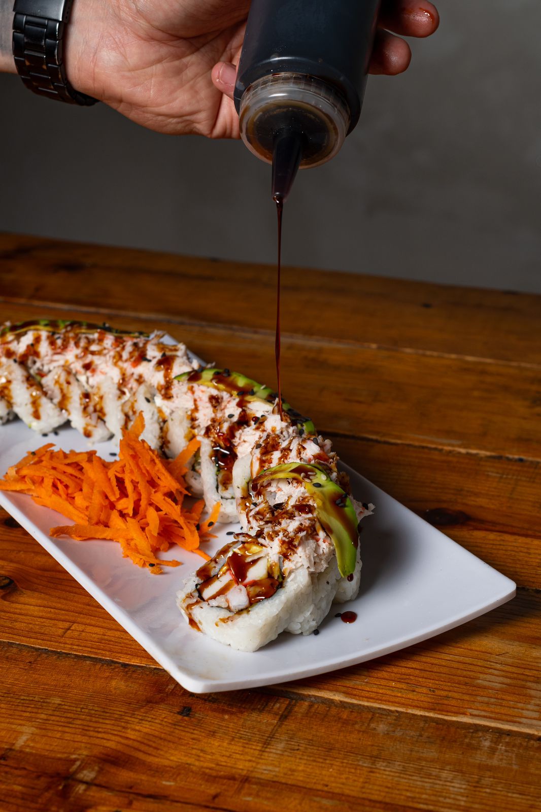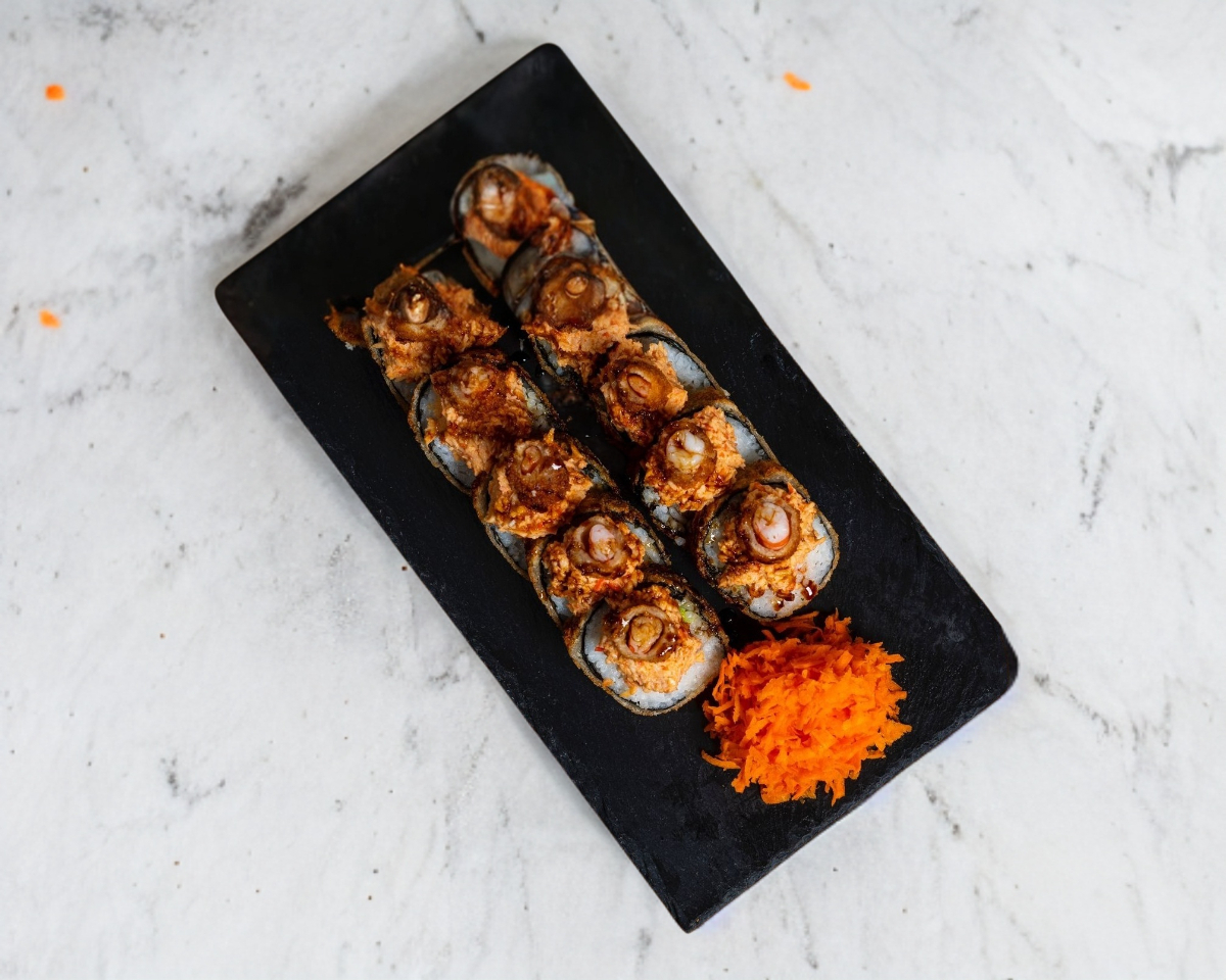 Por dentro, alga, aguacate, res y tocino, por fuera, forrado de aguacate, tampico, camarón empanizado con un toque de sriracha.