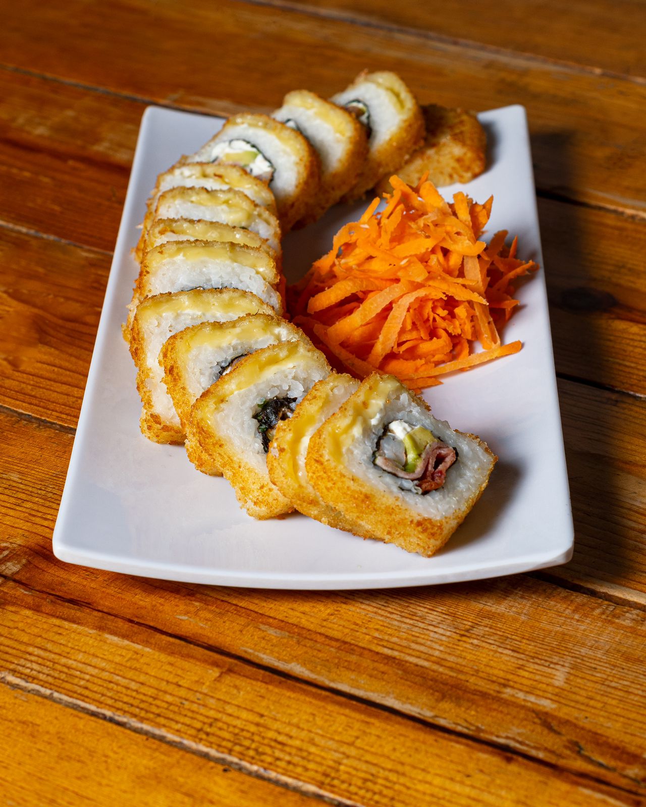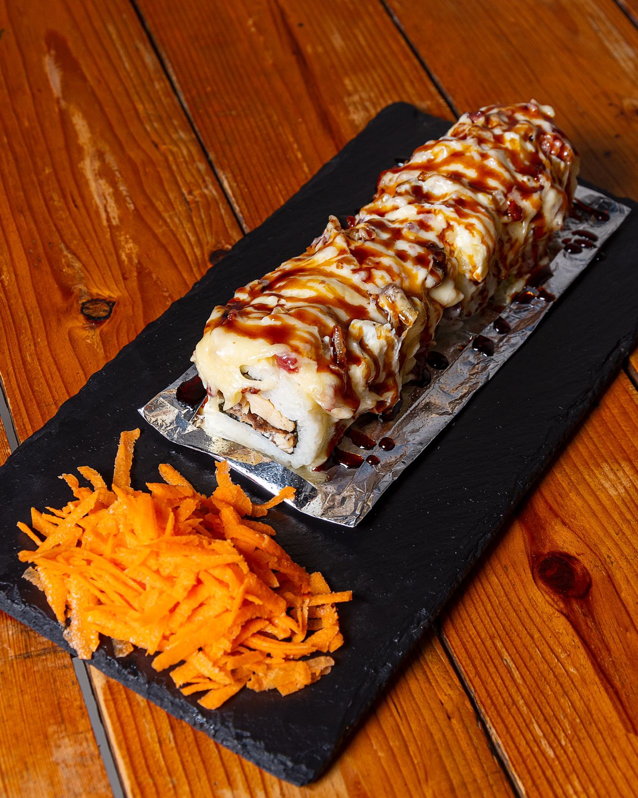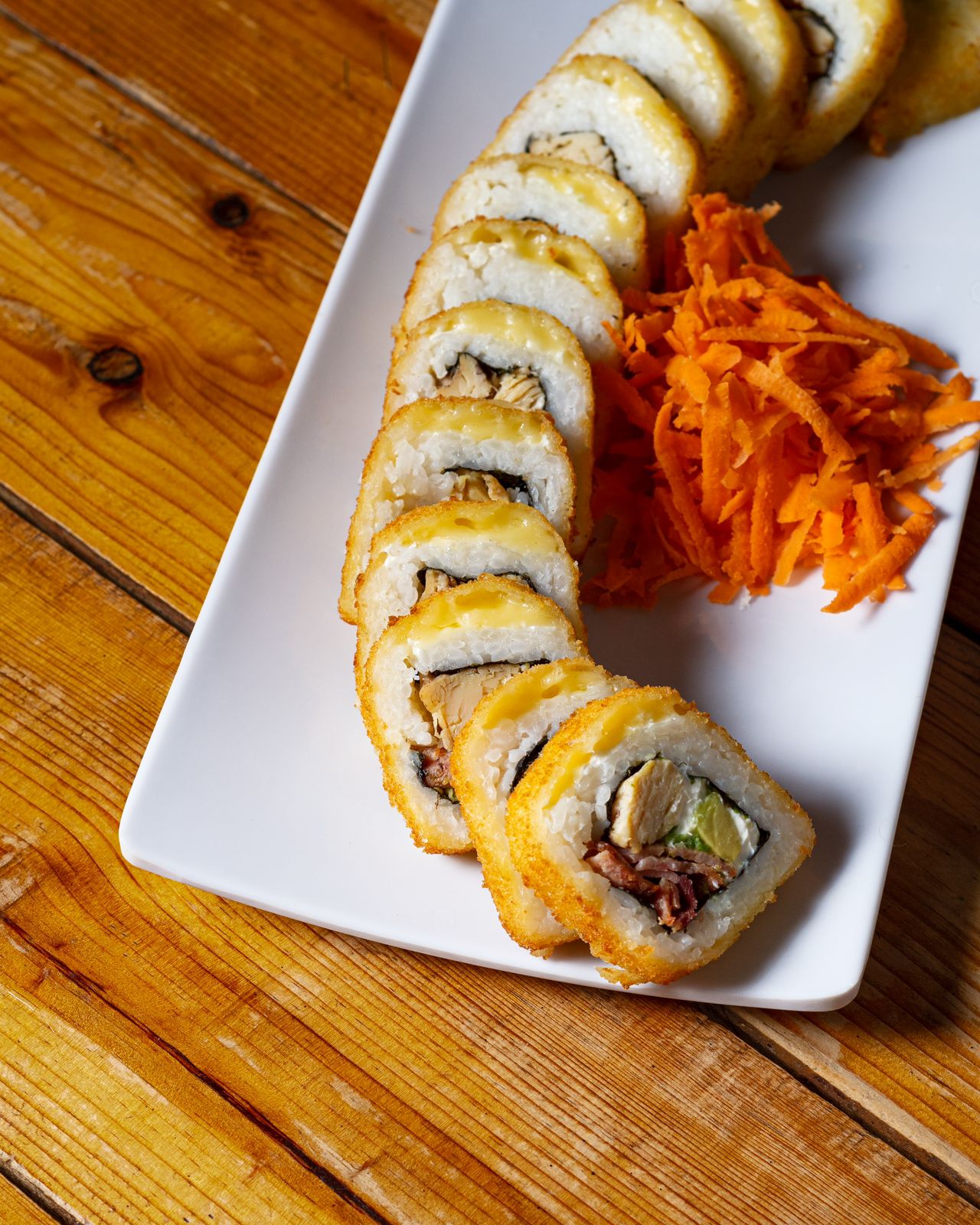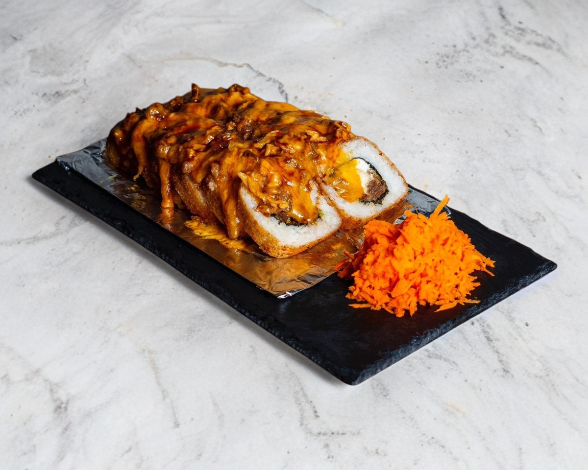 Rollo empanizado, por dentro: alga, Philadelphia, aguacate, res y pollo, por fuera, horneado con queso spicy, camarón empanizado en tiras, decorado con salsa de anguila.