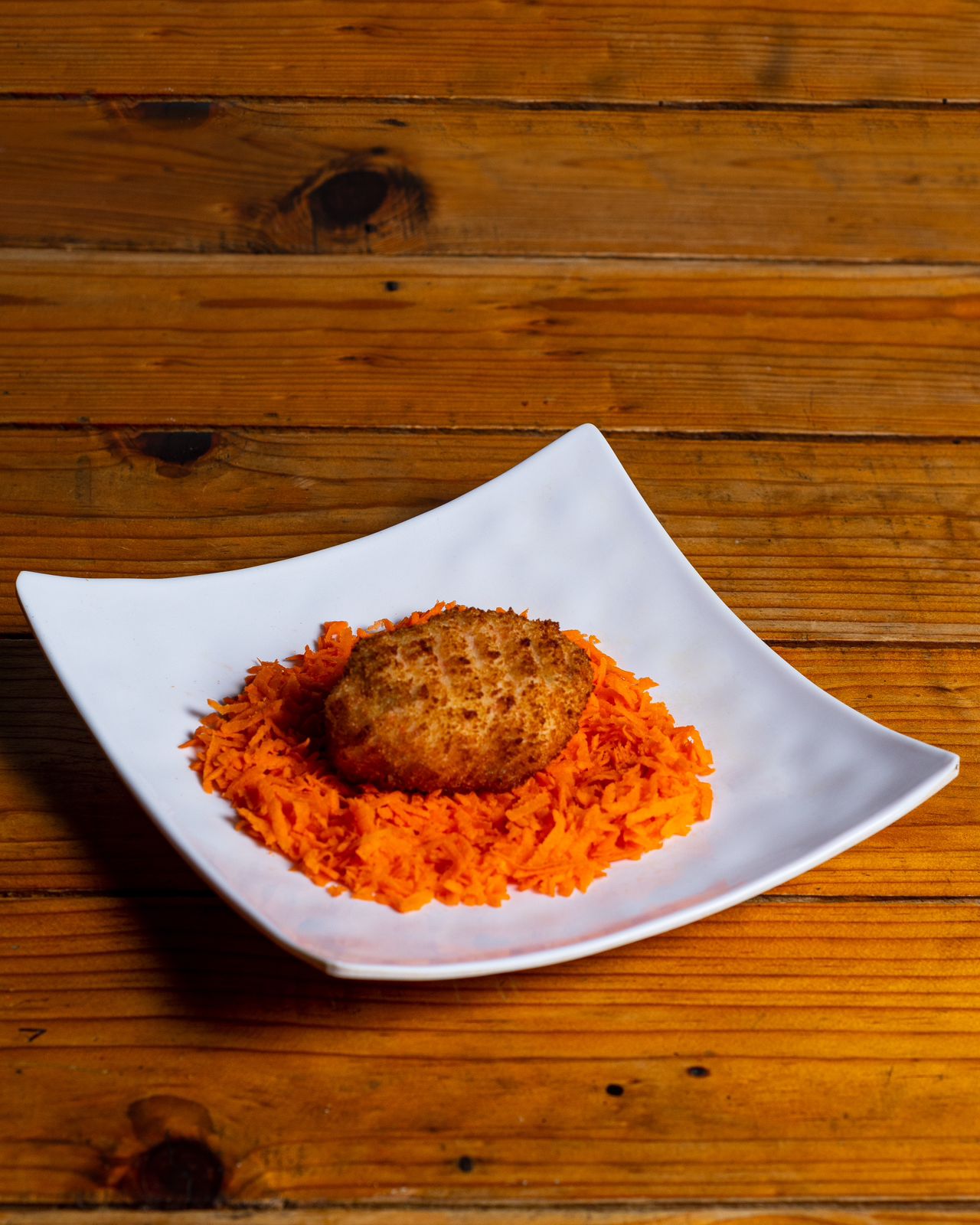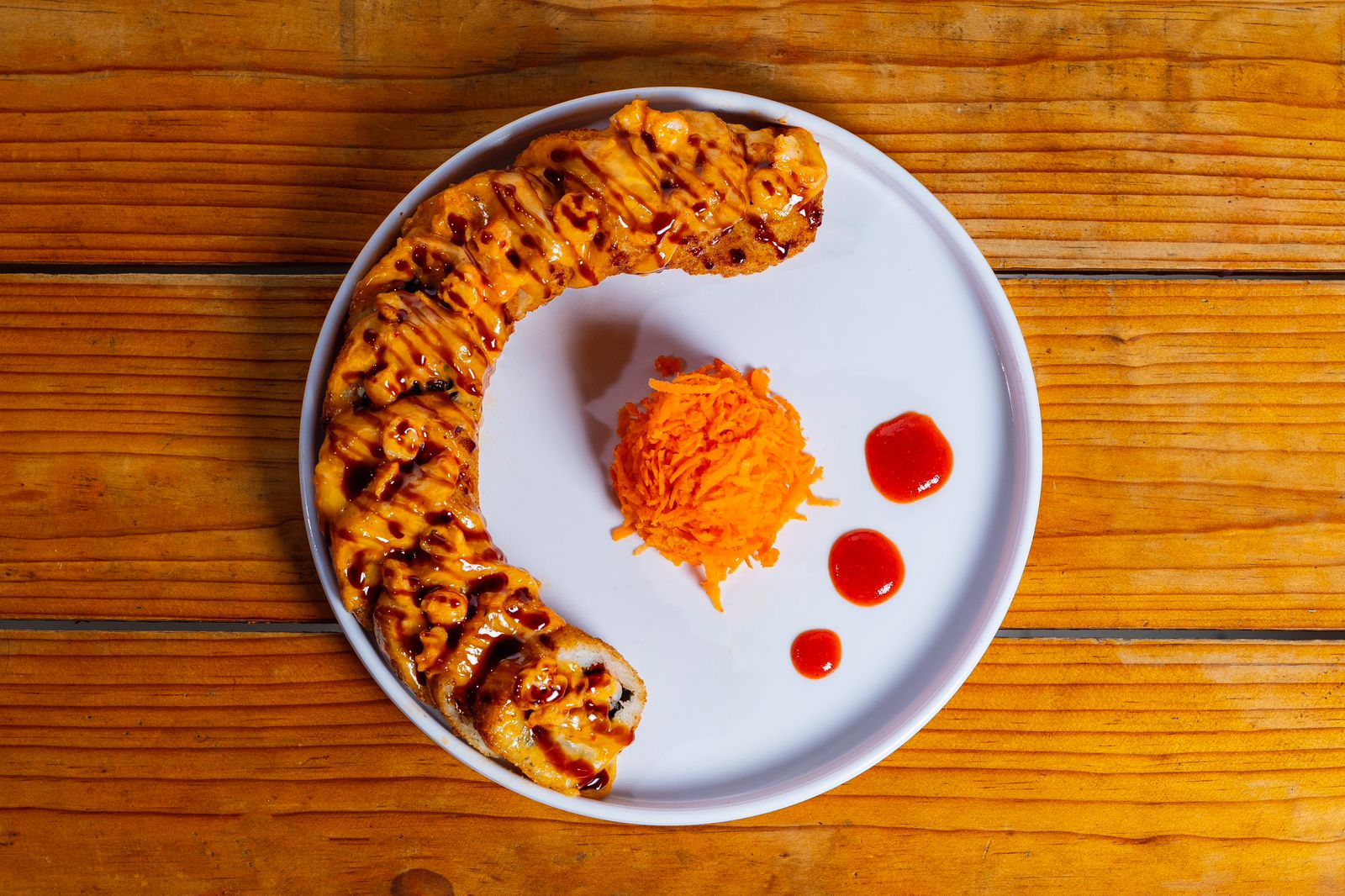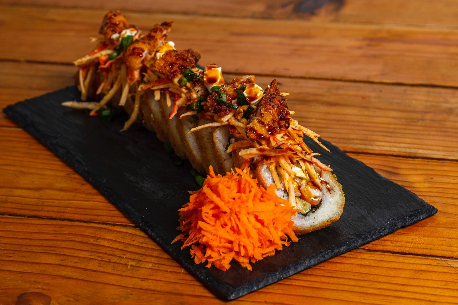 Rollo empanizado, por dentro: alga, Philadelphia, aguacate, res y pollo, por fuera, horneado con queso spicy, camarón empanizado en tiras, decorado con salsa de anguila.