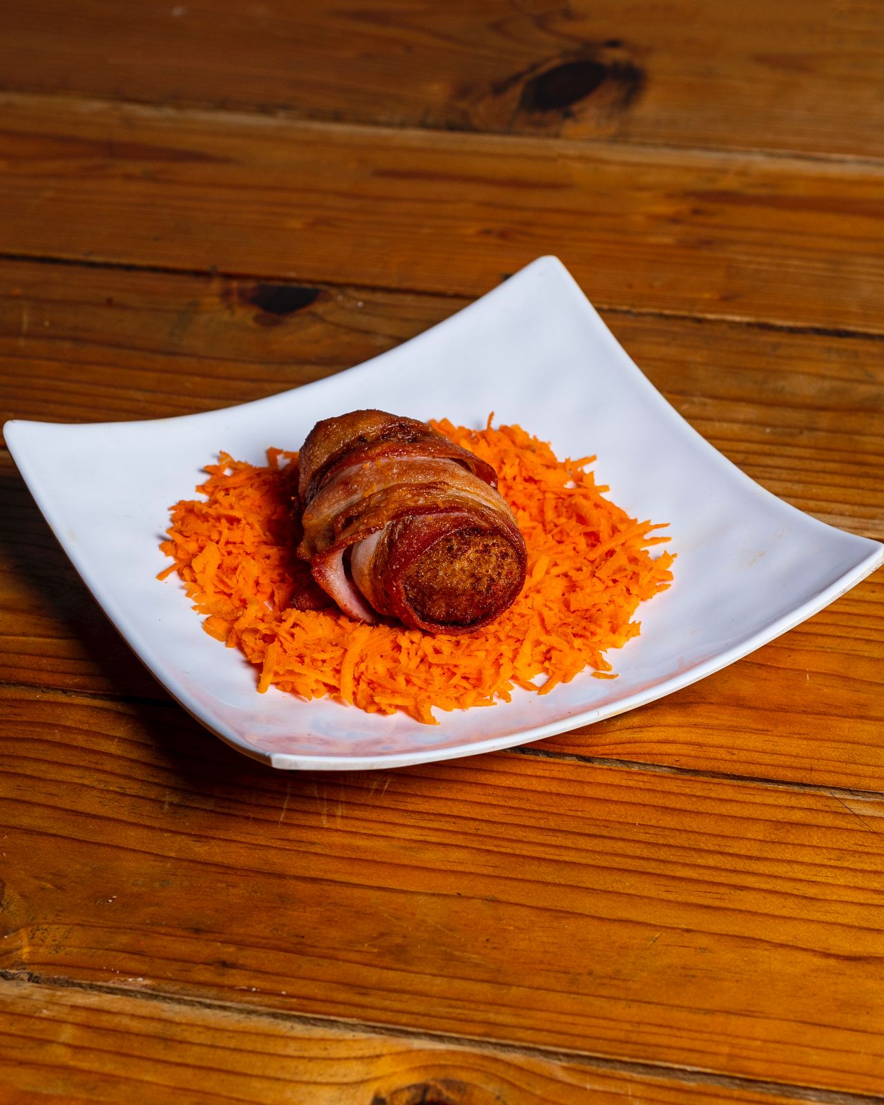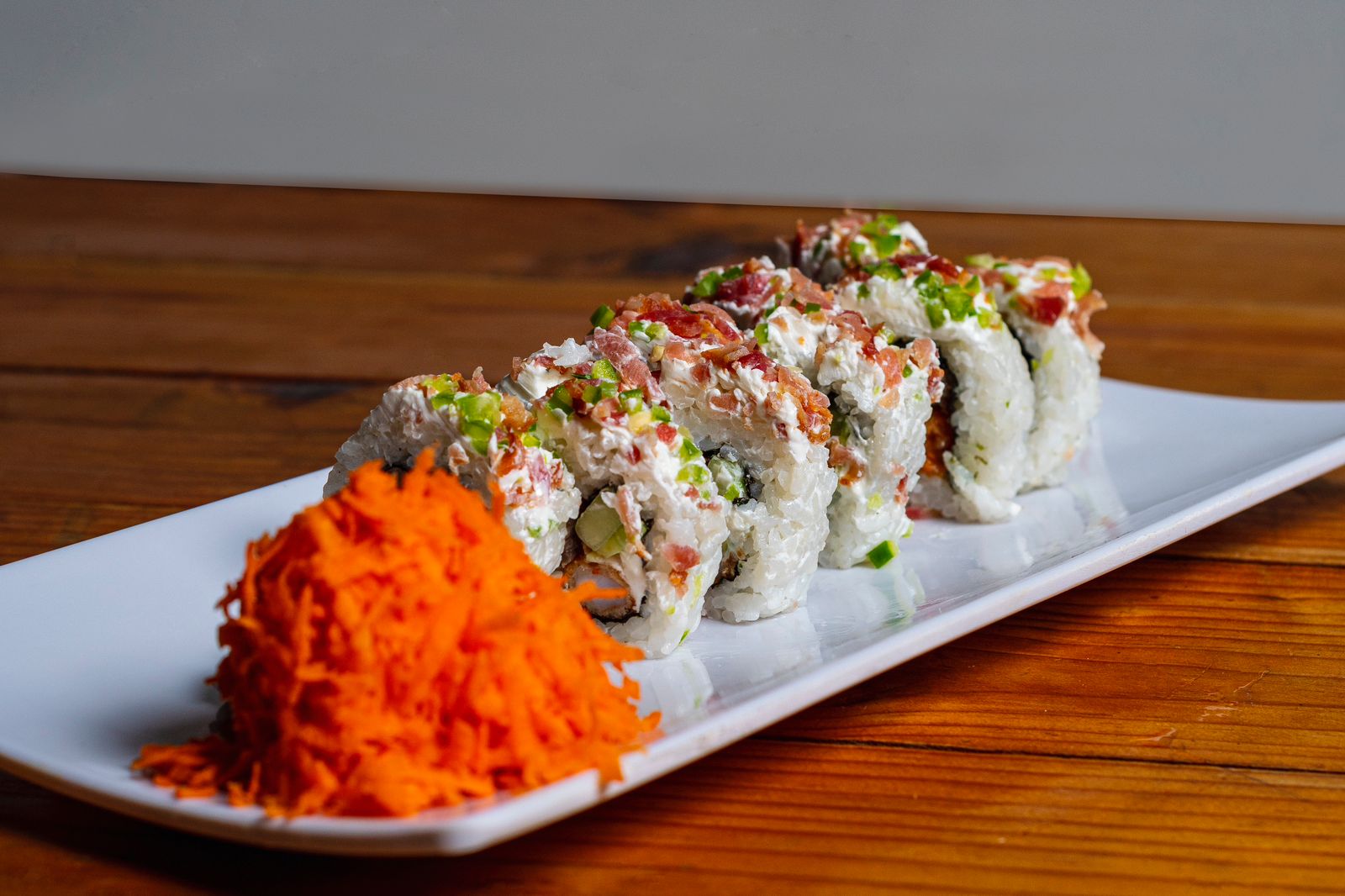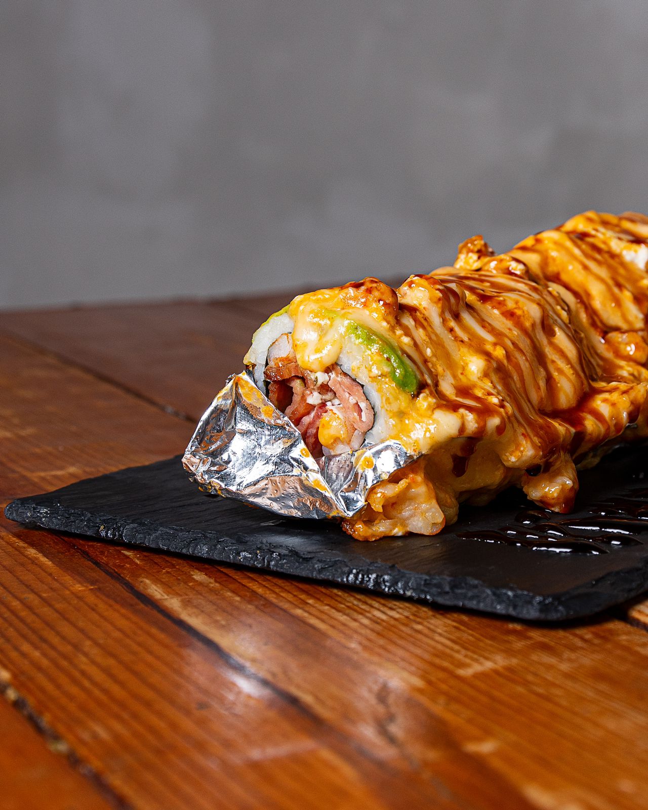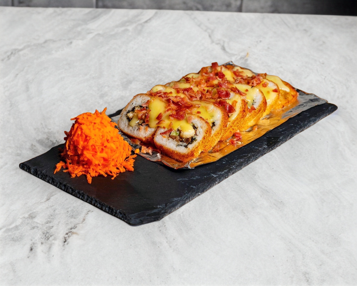 Por dentro, alga, Philadelphia, aguacate, camarón y tocino, por fuera, rollo empanizado cubierto de un gratinado de tocino y serrano.