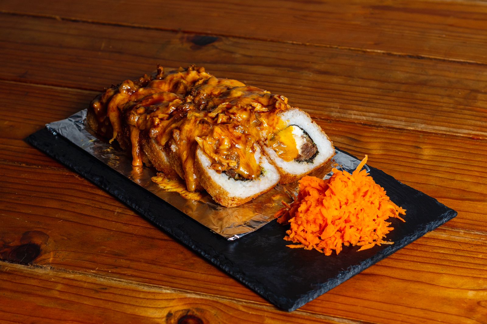 Rollo empanizado, por dentro, alga, Philadelphia, aguacate, res y pollo, por fuera, horneado con queso spicy, trozos de res y pollo, bañado en salsa de anguila.