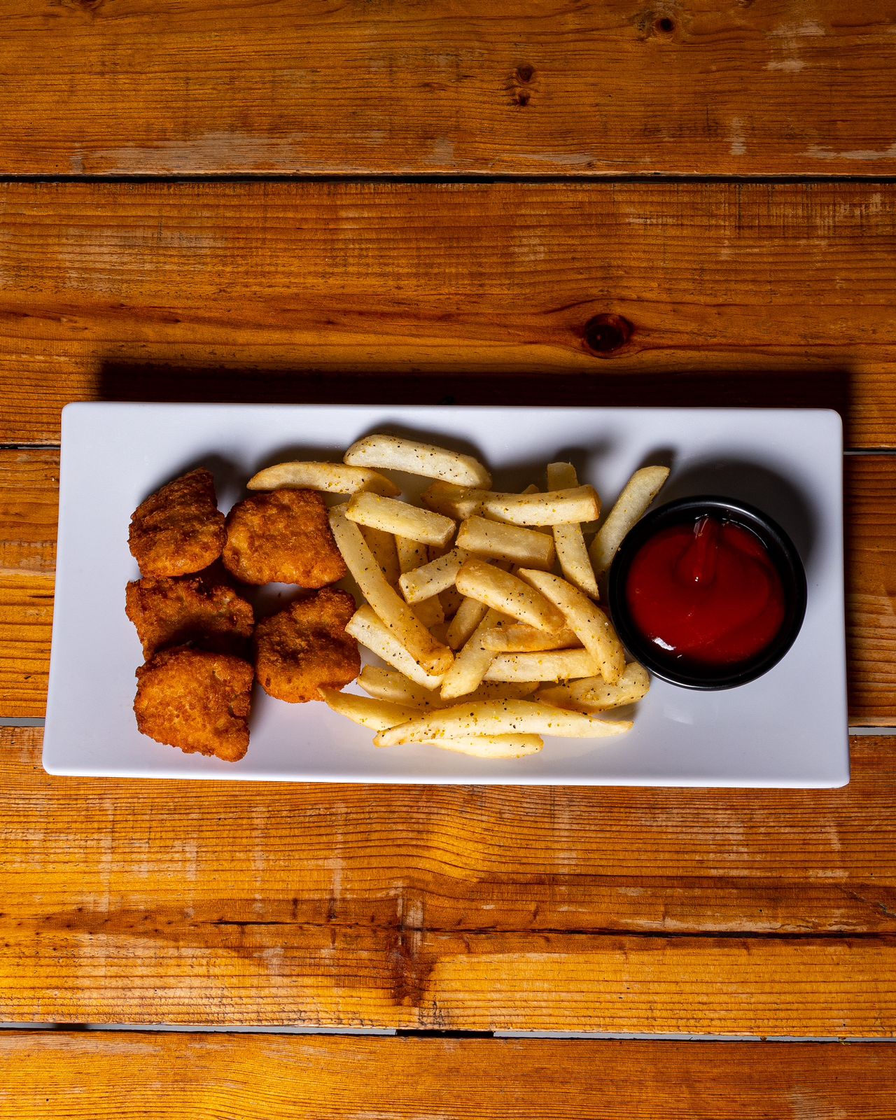 El favorito de los niños, deliciosa pechuga de pollo empanizada con papas fritas y cátsup.