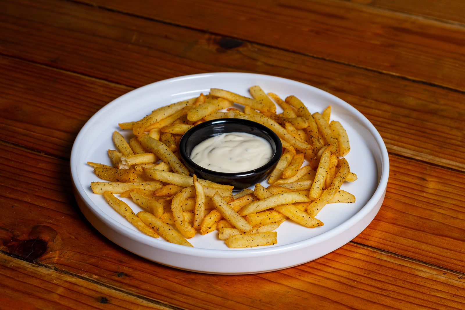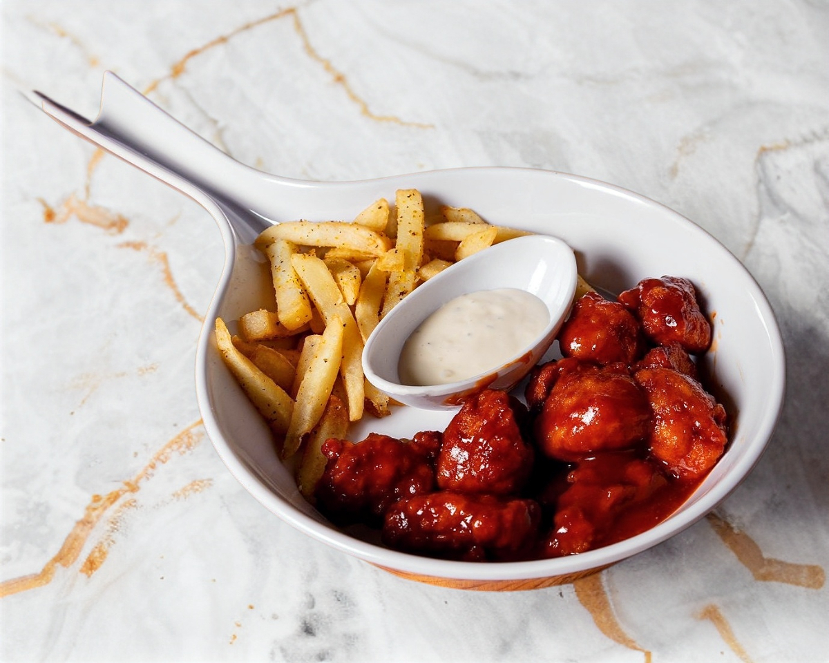 Boneless, bañados en salsa BBQ o búfalo, acompañado de papas a la francesa.