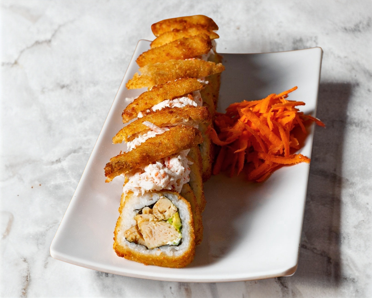 Rollo empanizado, por dentro alga, Philadelphia, aguacate y pollo, por fuera tampico y pollo empanizado.