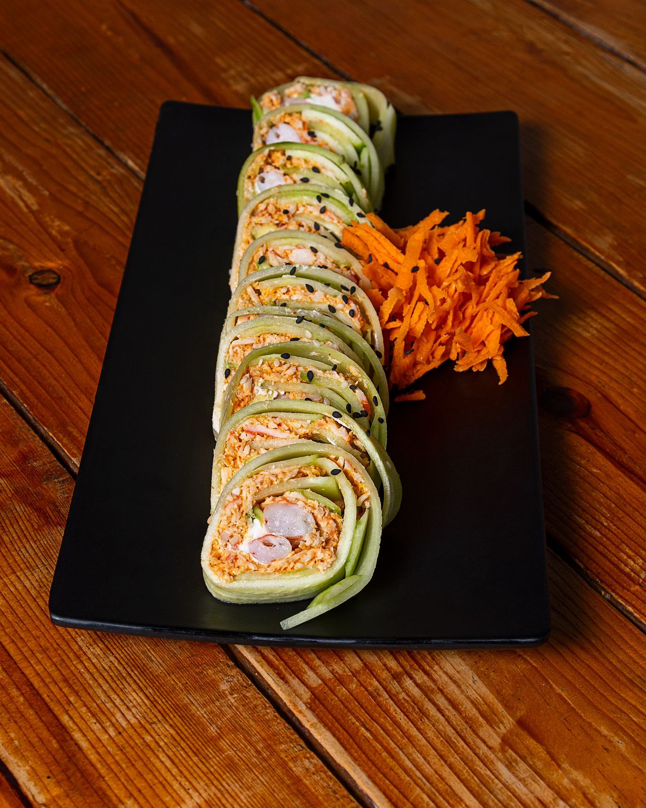 Por dentro, Philadelphia, aguacate, tampico spicy y camarón cocino, por fuera, forrado en cama de pepino.