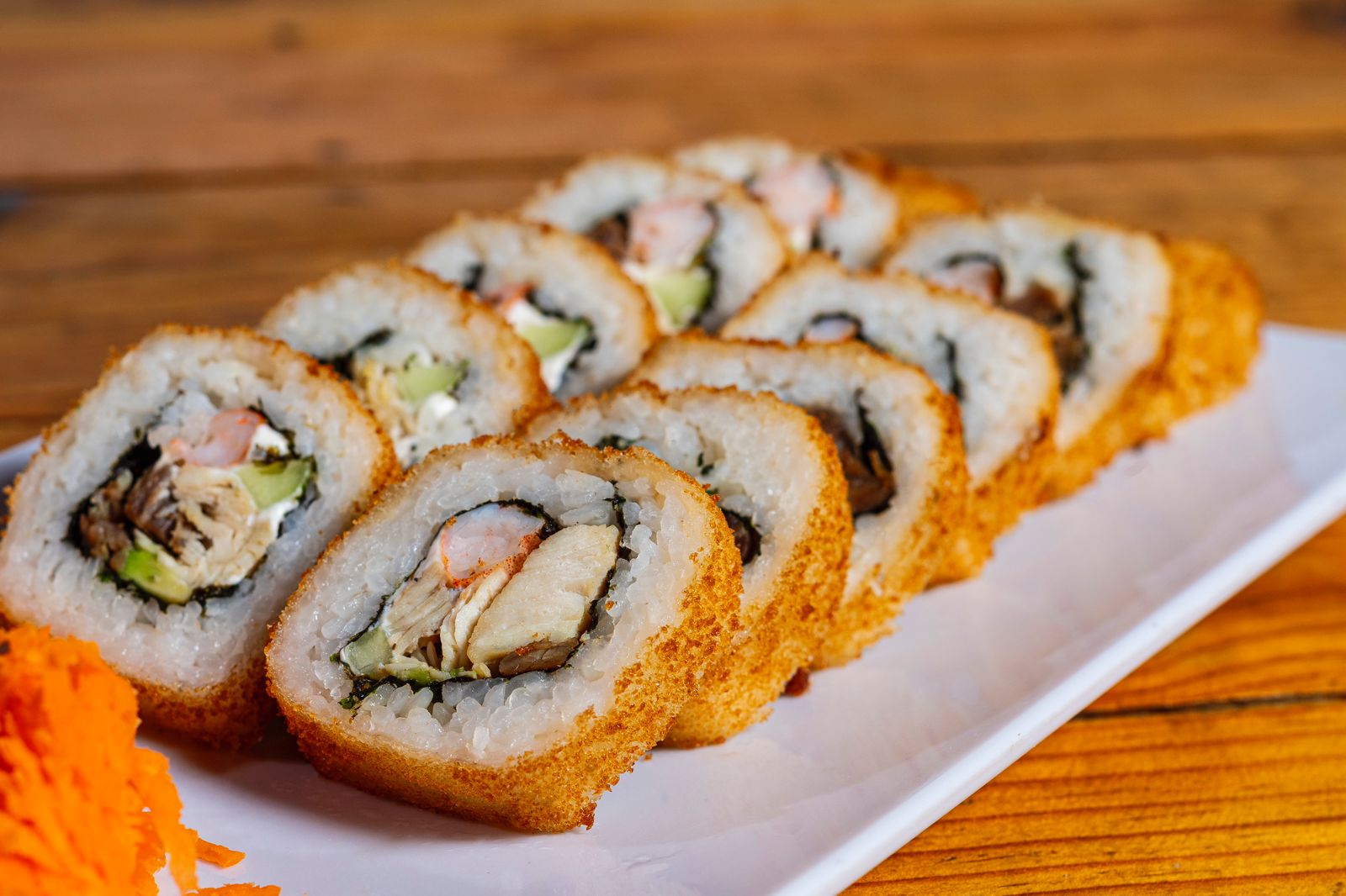 Rollo empanizado, por dentro alga, Philadelphia, aguacate, pollo, camarón y res.