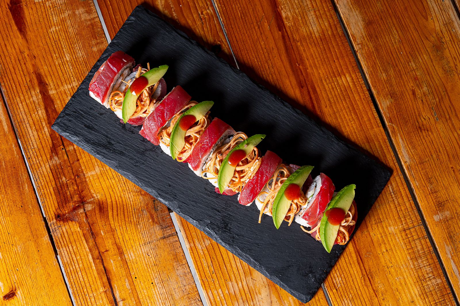 Por dentro, alga, Philadelphia, aguacate, tampico y camarón cocido, por fuera, forrado de atún fresco, kanikama spicy, coronado con aguacate y puntos de sriracha.