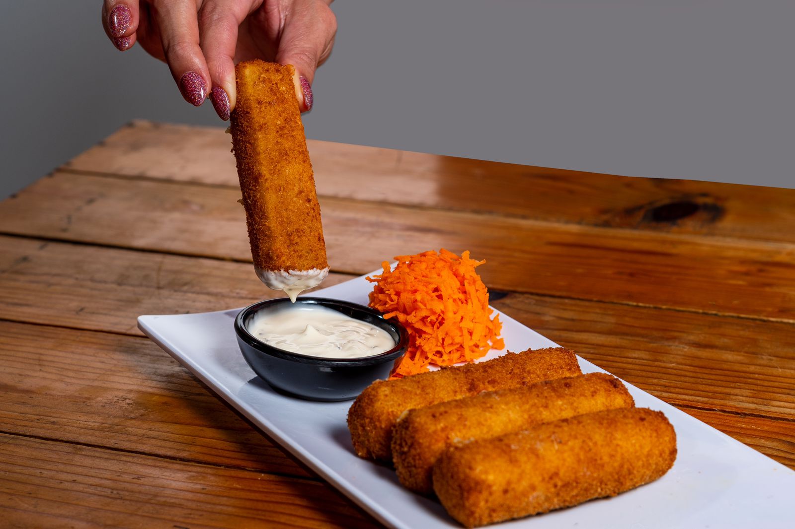 Deliciosos dedos de queso, elaborados al momento, acompañados con aderezo ranch.
