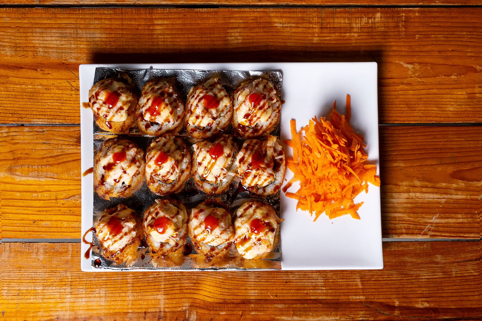Rollo empanizado, por dentro, alga, Philadelphia, aguacate, res, pollo y tocino, por fuera, gratinado especial picoso al horno, con toque de cebolla de frita, chile, res y tocino picado, sriracha y anguila.