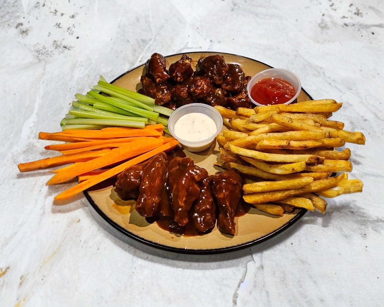 Orden con 200 Gramos de Alitas Fritas..... Bien Doraditas, Bañadas en la Salsa de tu Eleccion, acompañadas de Papas a la Francesa con una porcion de Catsup, Bastones de Apio y Zanahoria con una porcion de aderezo.