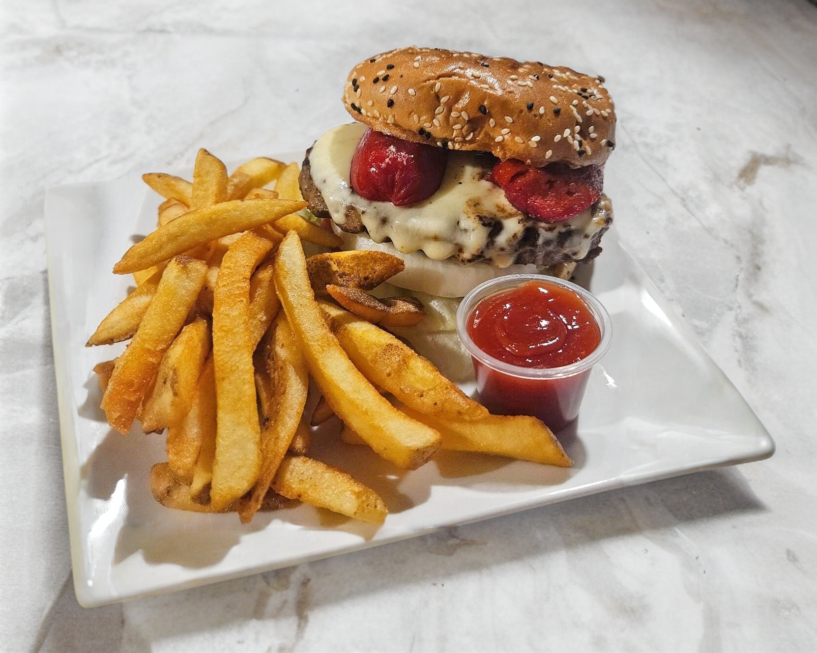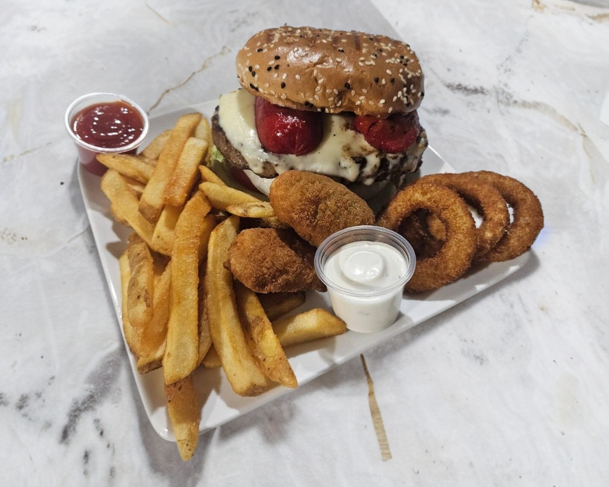 RICA HAMBURGUESA CON CARNE DE RES, 1 SALCHICHA PARRILLERA, QUESO, LECHUGA, TOMATE, CEBOLLA, JALAPEÑO Y AGUACATE (SUJETO A EXISTENCIA), ACOMPAÑADA CON UNA PORCION DE PAPAS A LA FRANCESA, 5 AROS DE CEBOLLA, 1 OZ DE ADEREZO RANCH Y 1 OZ DE CATSUP.