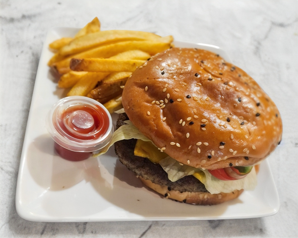 RICA HAMBURGUESA CON 150 GRMS. DE CARNE DE RES, 1 REBANADA DE QUESO, 1 REBANADA DE JAMON, LECHUGA, TOMATE, CEBOLLA, JALAPEÑO Y AGUACATE (SUJETO A EXISTENCIA), ACOMPAÑADA CON UNA PORCION DE PAPAS A LA FRANCESA Y 1 OZ DE CATSUP.