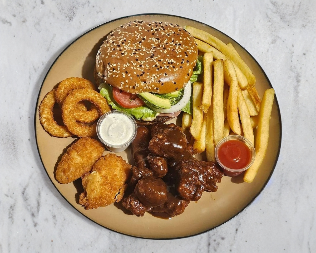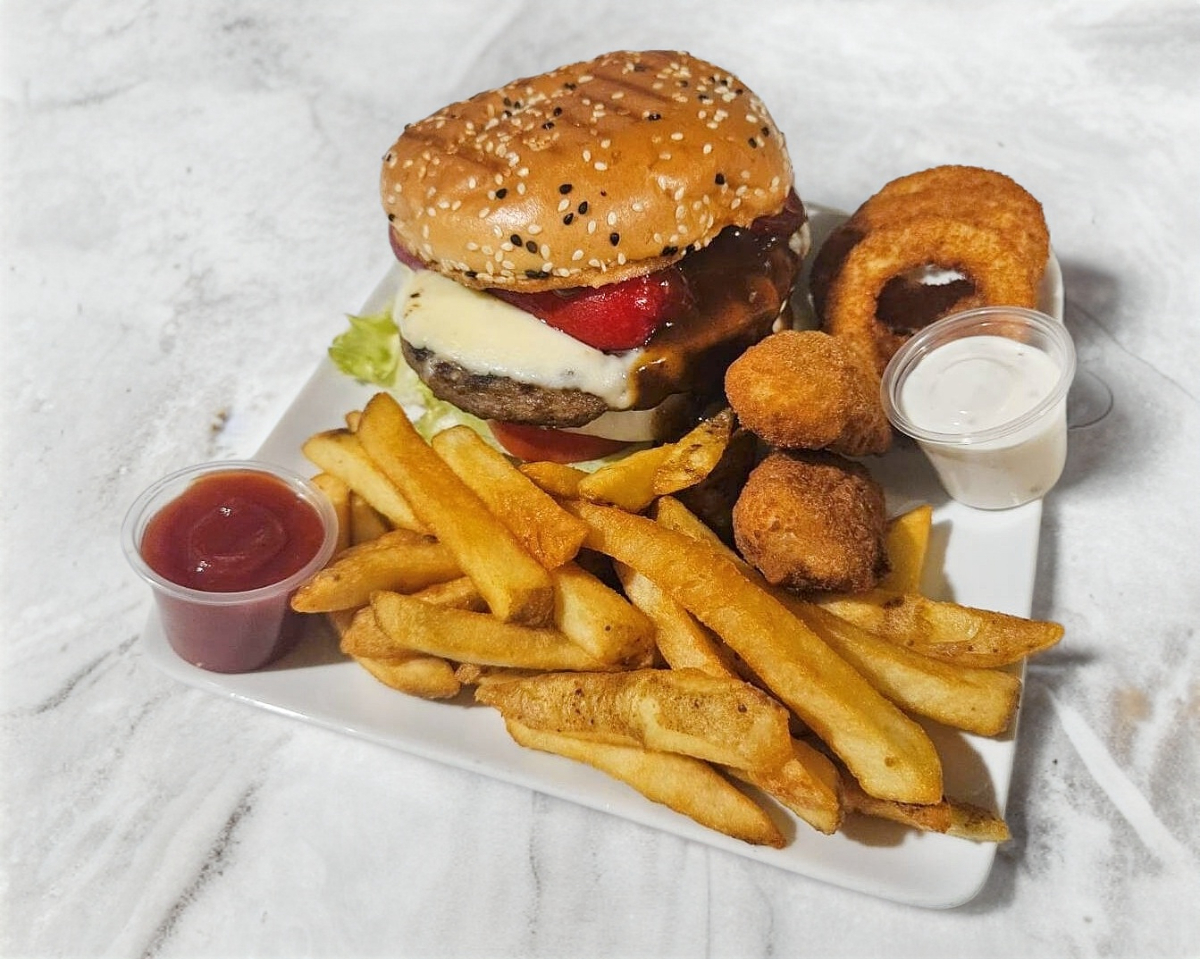 RICA HAMBURGUESA CON 150 GRMS. DE CARNE DE RES, JAMON, QUESO, LECHUGA, TOMATE, CEBOLLA, JALAPEÑO Y AGUACATE (SUJETO A EXISTENCIA), ACOMPAÑADA CON UNA PORCION DE PAPAS A LA FRANCESA, UNA PORCION DE BONELESS, 5 AROS DE CEBOLLA, 1 OZ DE ADEREZO RANCH Y 1 OZ DE CATSUP.