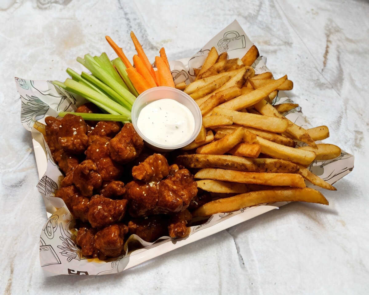 Orden con 200 gramos de Boneless Bañados en la Salsa de tu Eleccion, acompañados de Papas a la Francesa con una porcion de Catsup, Bastones de Apio y Zanahoria con una porcion de aderezo.