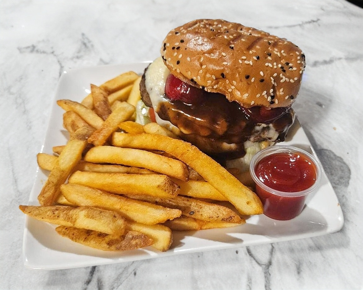 RICA HAMBURGUESA CON CARNE DE RES, 1 SALCHICHA PARRILLERA, QUESO, LECHUGA, TOMATE, CEBOLLA, JALAPEÑO Y AGUACATE (SUJETO A EXISTENCIA), ACOMPAÑADA CON UNA PORCION DE PAPAS A LA FRANCESA Y 1 OZ DE CATSUP.