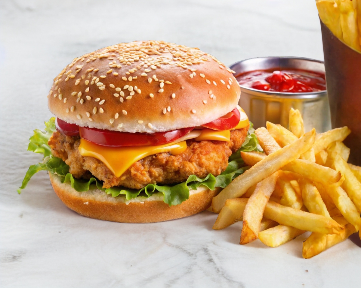 RICA HAMBURGUESA CON DELICIOSA CARNE DE POLLO EMPANIZADO DE EXCELENTE CALIDAD, 1 REBANADA DE QUESO, 1 REBANADA DE JAMON, LECHUGA, TOMATE, CEBOLLA, JALAPEÑO Y AGUACATE (SUJETO A EXISTENCIA), ACOMPAÑADA CON UNA PORCION DE PAPAS A LA FRANCESA Y 1 OZ DE CATSUP.