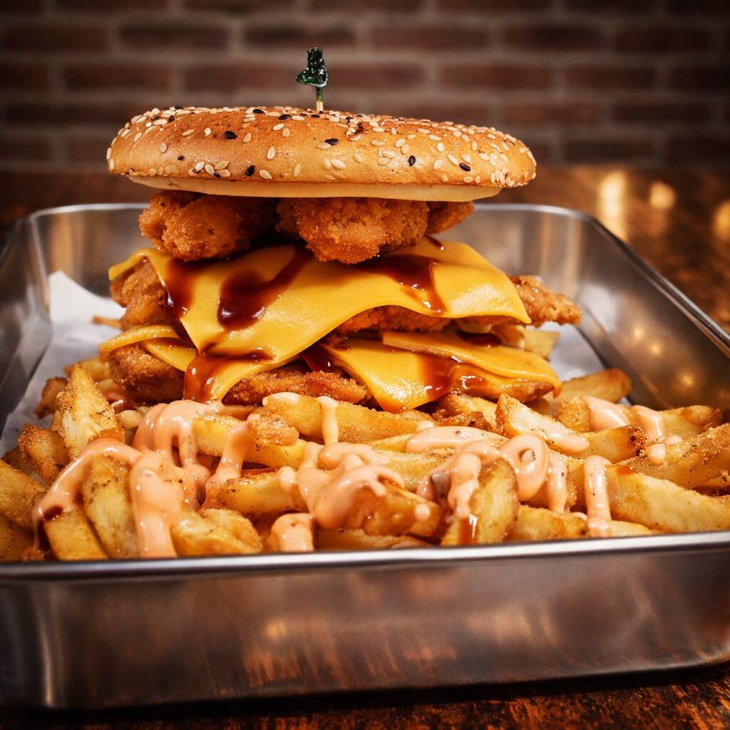 EXPLOTA TUS SENTIDOS, CON ESTA INCREIBLE HAMBURGUESA.... IMAGINA, 2 TENDERS, 2 QUESOS AMERICANOS, 2 MOZARELLA FINGER´S, TODO BAÑADO EN NUESTRA SALSA ESPECIAL BBQ-MANGO CRAZY, ABRAZODO EN UN PAN PARRILLERO DORADO EN MANTEQUILLA, CON MAYONESA EN AMBOS PANES Y ACOMPAÑADA DE UNA PORCION DE PAPAS A LA FRANCESA BAÑADAS EN SALSA BBQ-MANGO CRAZY Y EN NUESTRA SALSA ESPECIAL TIPO CANE´S
