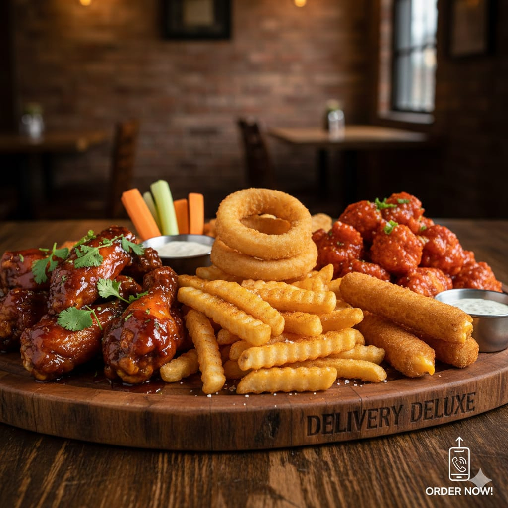 DISFRUTA DE ESTA EXQUISITA SELECCION QUE CONTIENE, 1 PORCION DE ALITAS, 1 PORCION DE BONELESS, PAPAS A LA FRANCESA, 5 AROS DE CEBOLLA, 3 PALITOS DE QUESO MOZZARELLA, 2 OZ DE RANCH, 2 OZ DE CATSUP Y VEGETALES.