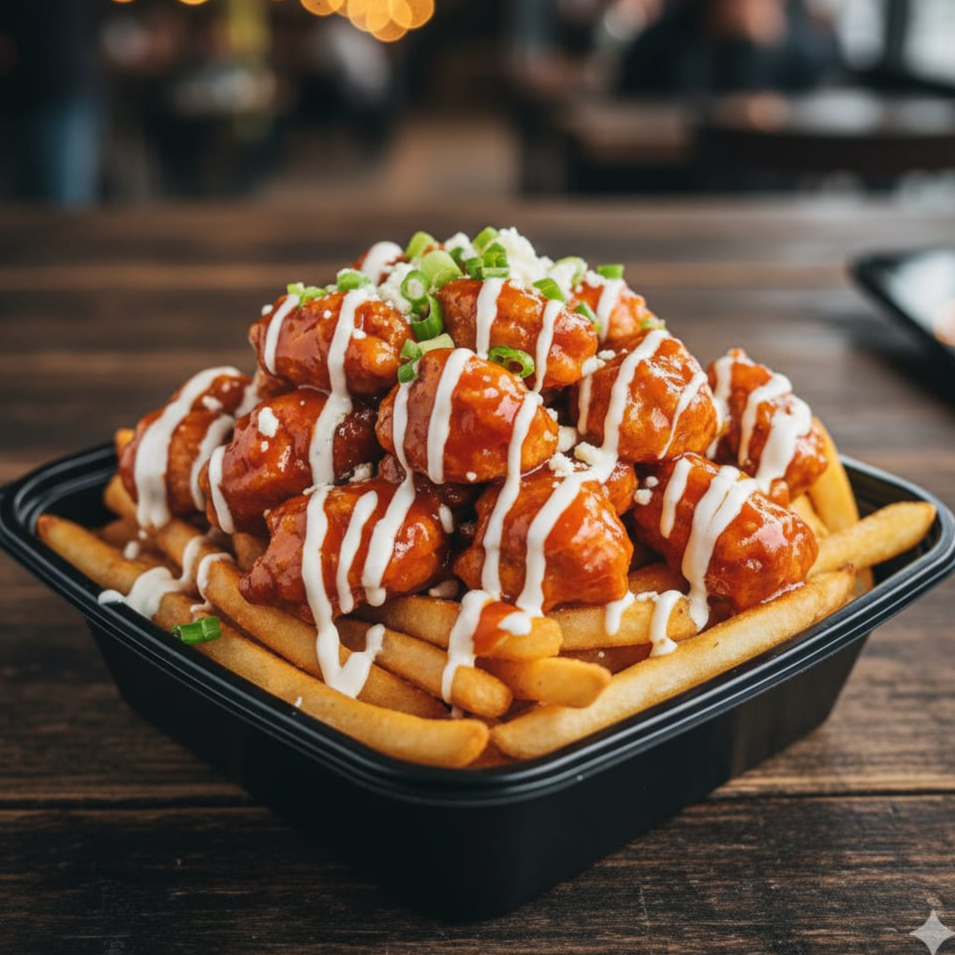 DELEITATE CON ESTE EXQUISITO PLATILLO, MONCHOSO POR SOBRE TODO.... SON 250 GRAMOS DE BONELESS BBQ-MANGO HABANERO. (DULCE PICOSITO) SOBRE UNA CAMA DE 250 GRAMOS DE PAPAS A LA FRANCESA, CORONADO CON NUESTRA SALSA ESPECIAL